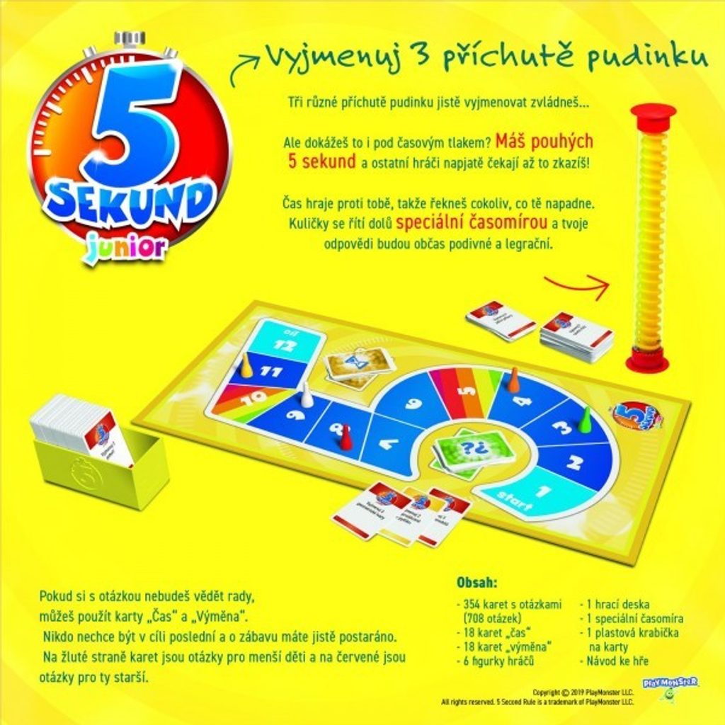 Vyjmenuj 3 příchutě pudinku. To jistě zvládneš... Ale dokážeš to pod tlakem? Máš pouhých 5 sekund a ostatní hráči napjatě čekají až to zkazíš. Čas hraje proti tobě, takže řekneš cokoliv, co tě napadne. Kuličky se řítí dolů speciální časomírou a tvoje odpovědi budou občas podivné a legrační.