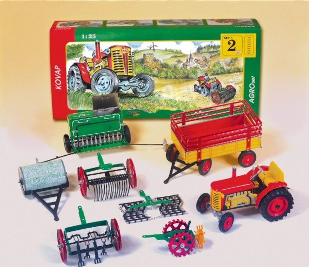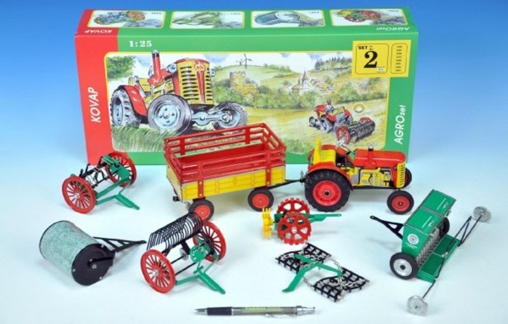 Sada obsahuje traktor vybavený mechanickým pérovým strojkem natahovaným klíčkem (3 rozdílné rychlosti vpřed, jedna rychlost vzad, neutrál a ruční brzda), vlečku, secí stroj, válec, obracečku, pohrabovadlo, čerta, brány. Příslušenství je vybaveno mechanickými převody a pracuje jako skutečné stroje.