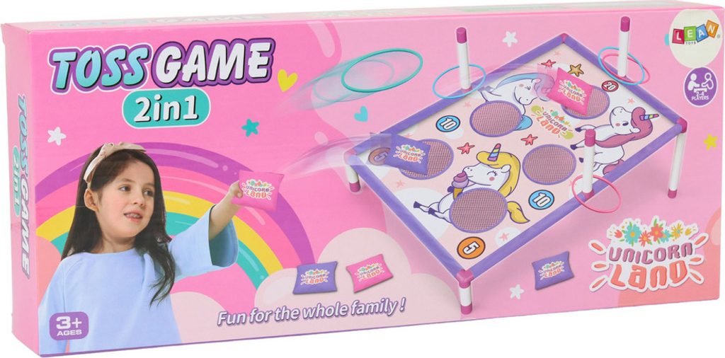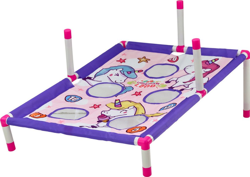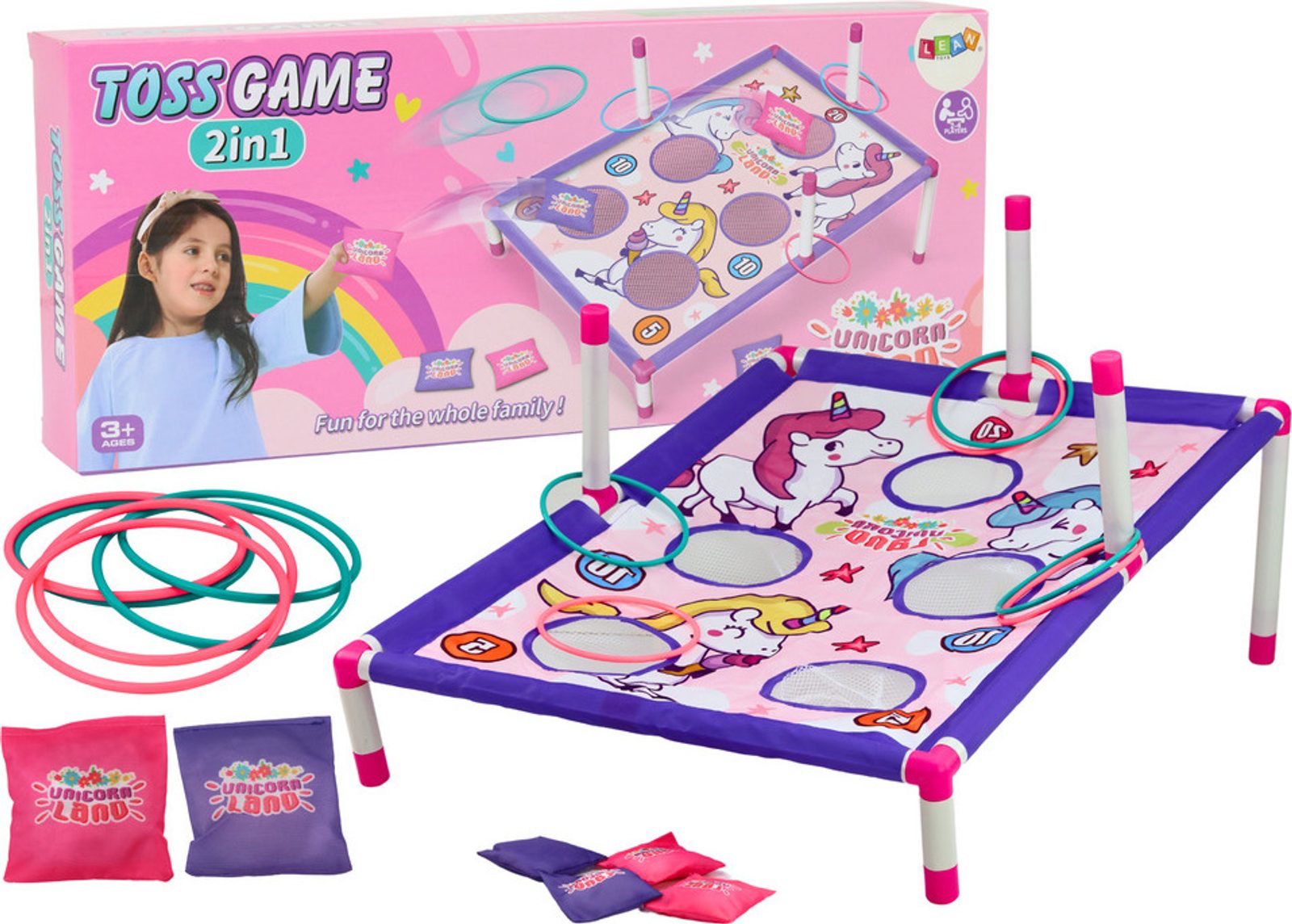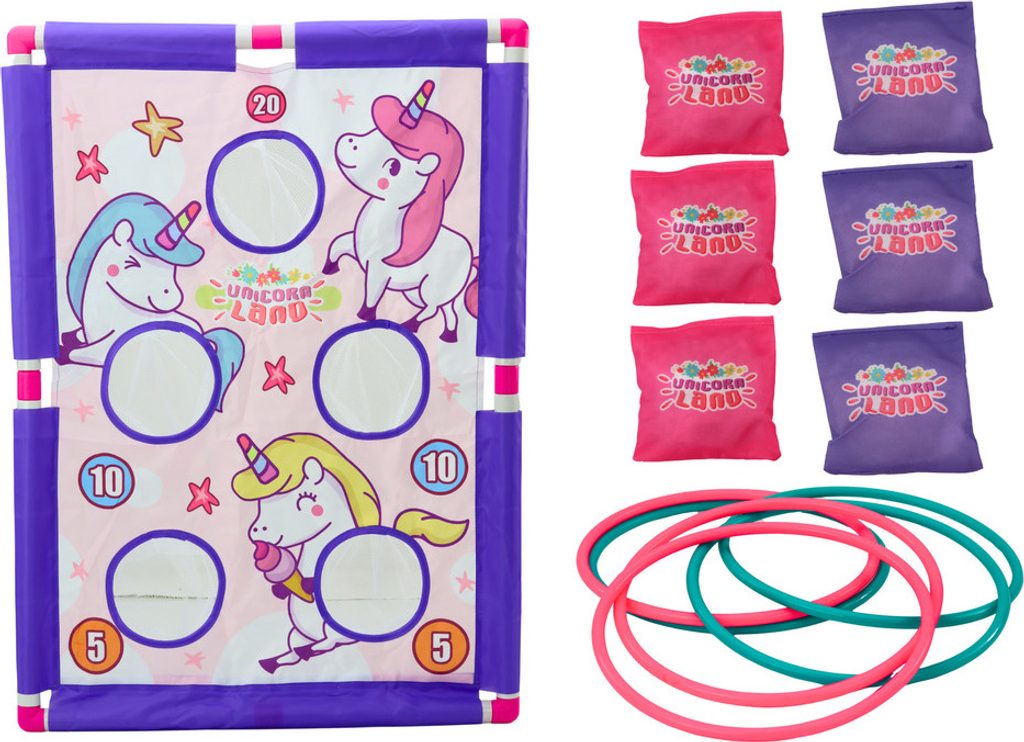 Hru tvoří pevná barevná deska zdobená obrázky roztomilých jednorožců, která nejen vybízí ke hře, ale také inspiruje dětskou fantazii. Deska je vybavena bodovacím systémem, který přidává prvek soutěžení a vzrušení během hry. Sada obsahuje speciálně navržené vrhací vaky, které zajišťují stabilitu a přesnost zásahů, a také barevné kroužky.