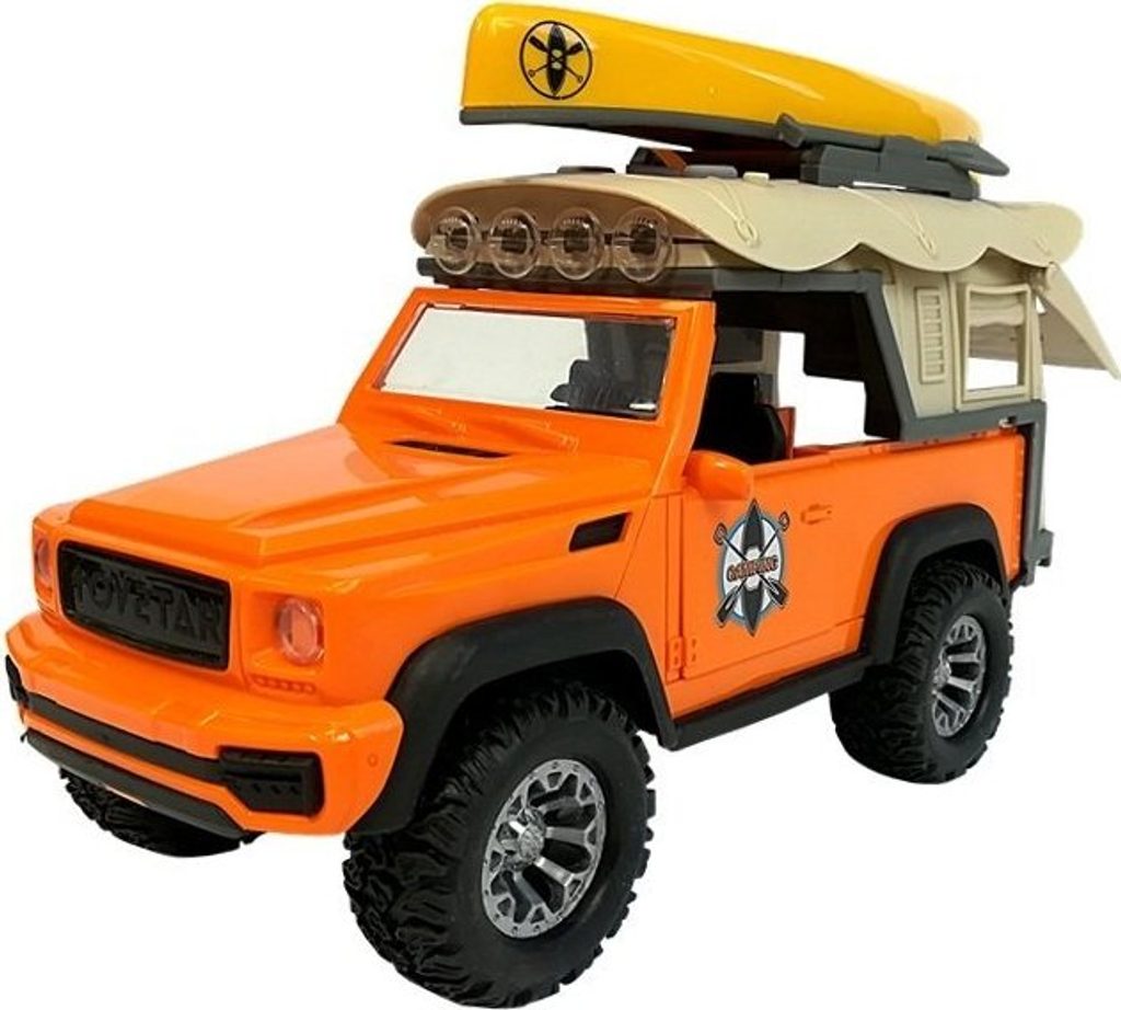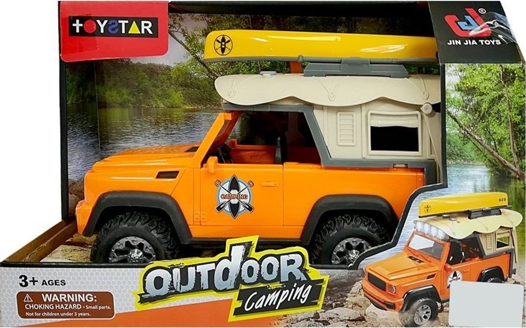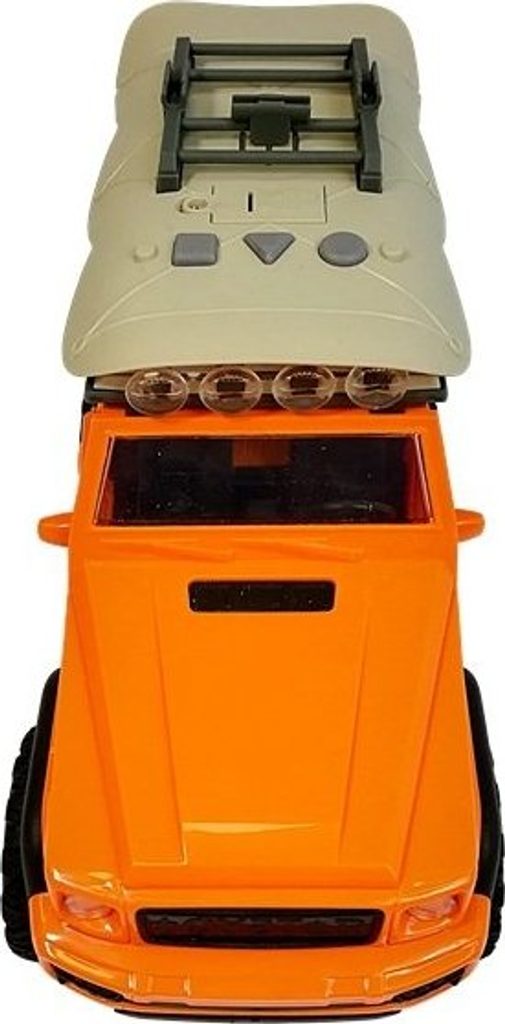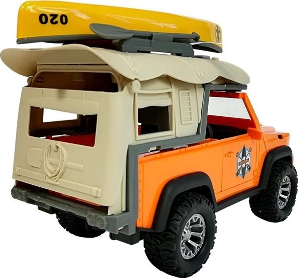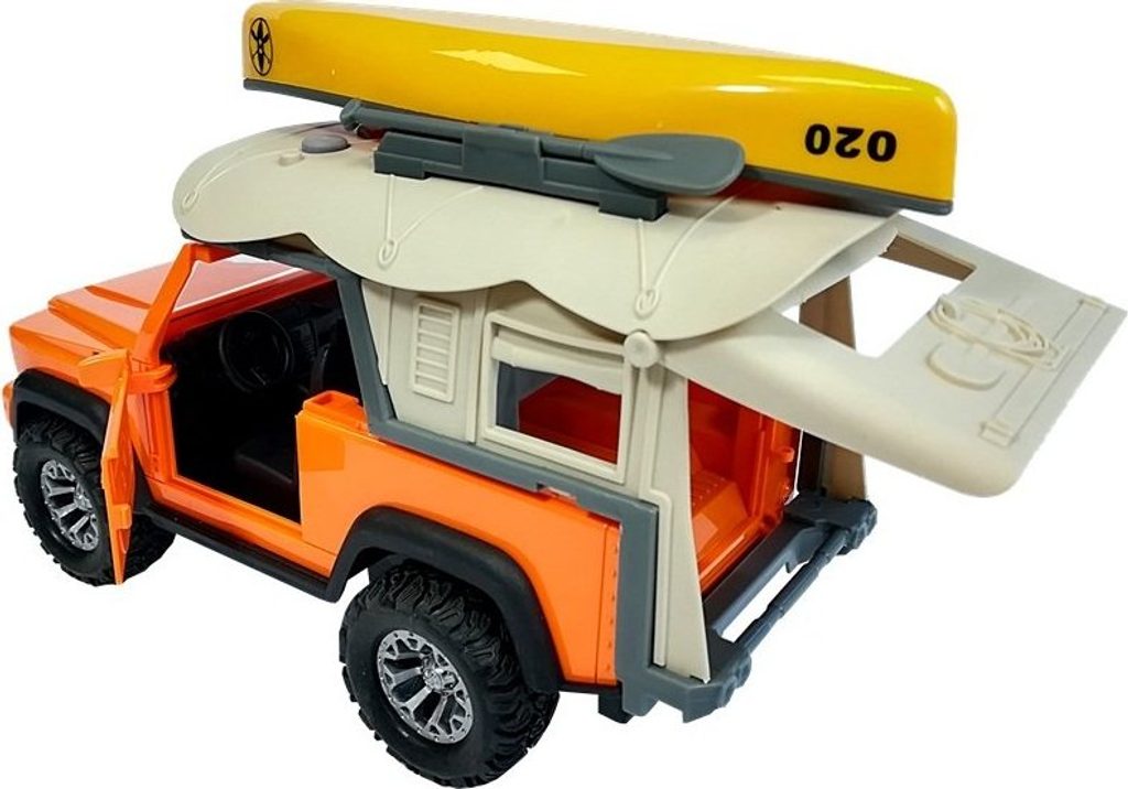 Pokud je vaše dítě fanouškem cestování a komunikace s přírodou, bude to pro něj ideální sada. Představujeme krásné kempingové vozidlo s možností otevřít zadní výklopné dveře a dveře. Auto má zvukové a světelné efekty, tedy svítící světlomety. Má gumové pneumatiky, které mu umožňují pohyb na různých typech povrchů. Největší výhodou naší sady je přiložený kajak s pádly, který lze převážet na střeše Jeepu. Auto je oranžové a kajak žluto-šedý.