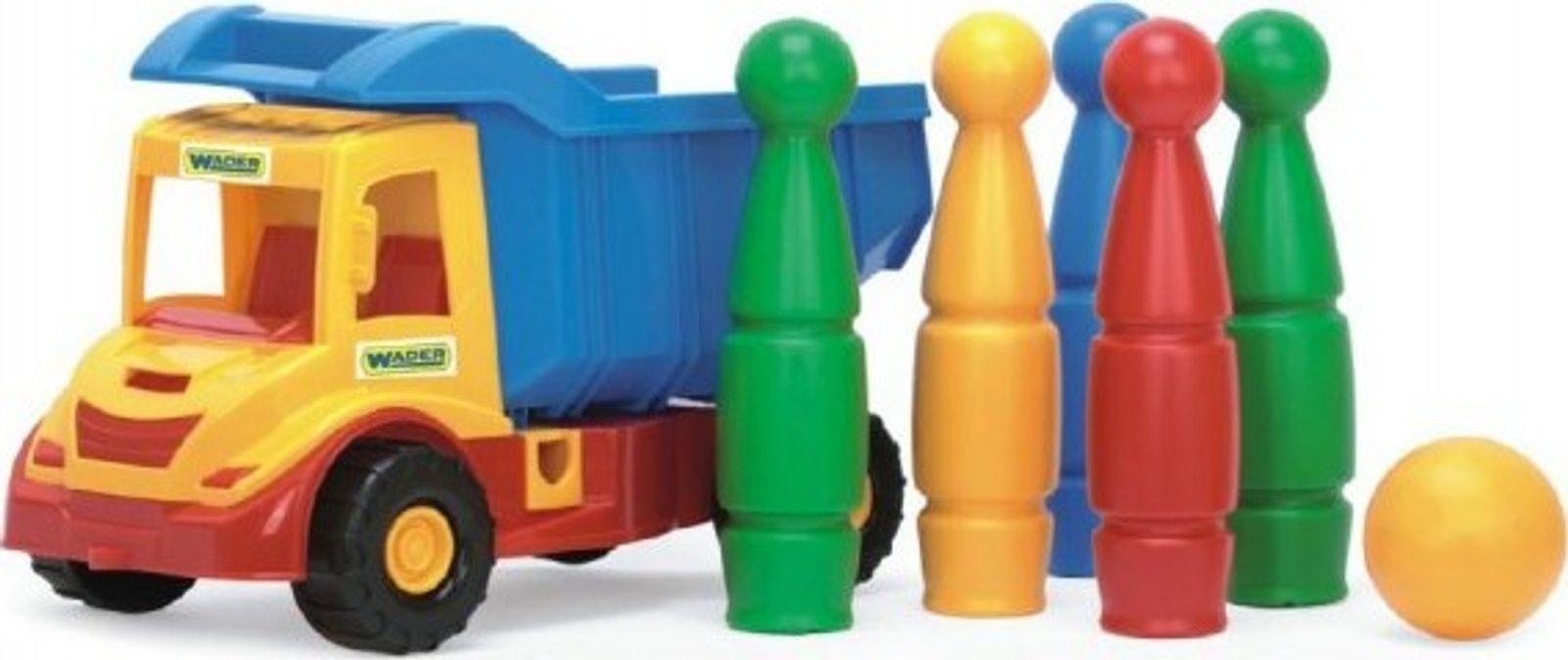 Auto Multiruck se sklápěčkou a nakladačem je vyroben z kvalitních nezávadných plastů značky Wader. Hračka je ideální jak na domácí použití tak i ven na pískoviště. K tomuto autu jsou také kuželky.