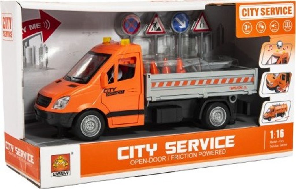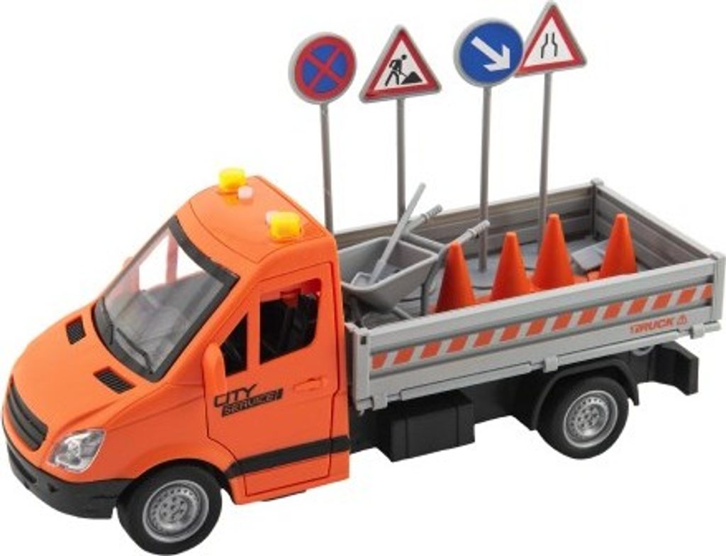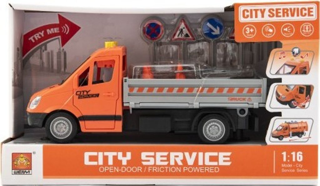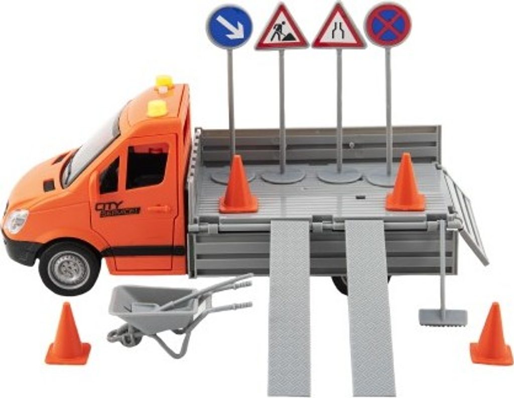 Silničářské auto plné dopravních značek a pomůcek potřebných pro práci každého silničáře. Údržba silnic, chodníků a parků je důležitá v každé obci a městě. Auto je v měřítku 1:16, je na setrvačník, se světlem a se zvukem. Baterie 3x AG13 jsou součástí balení.