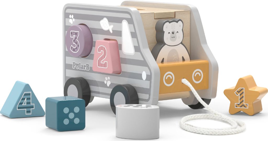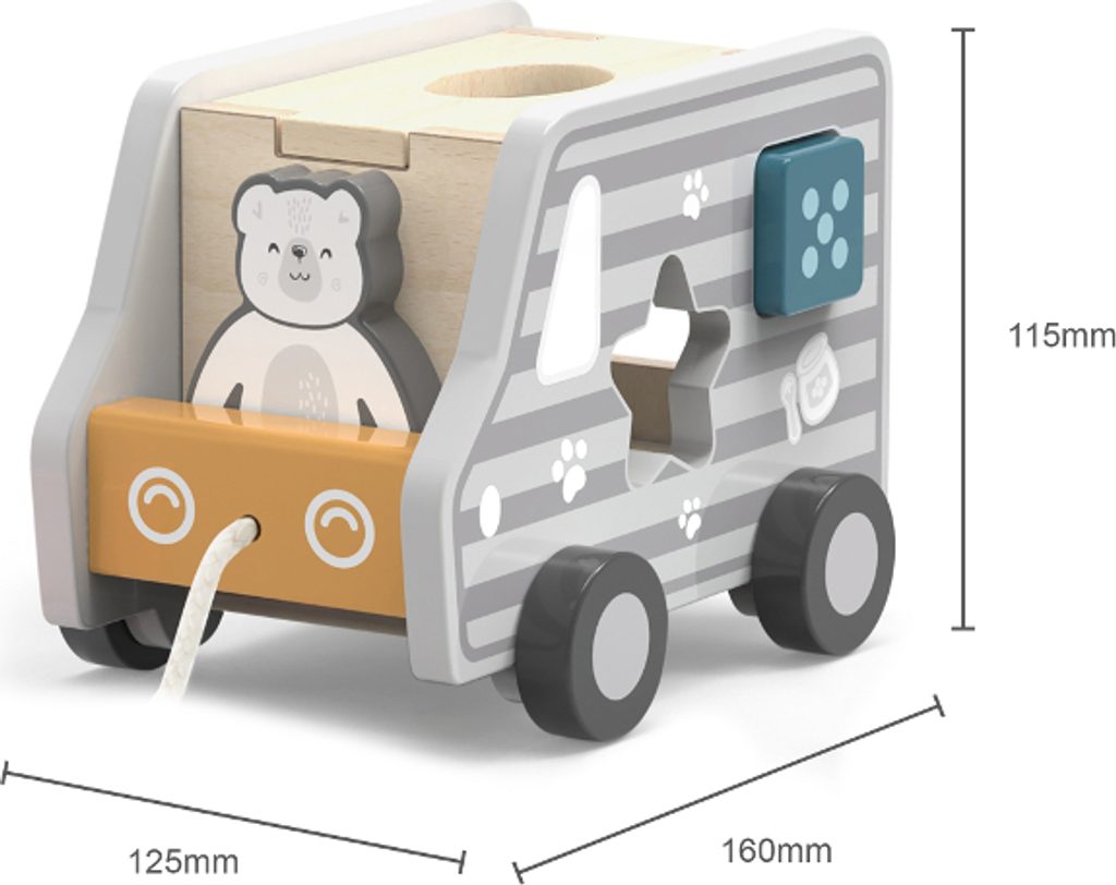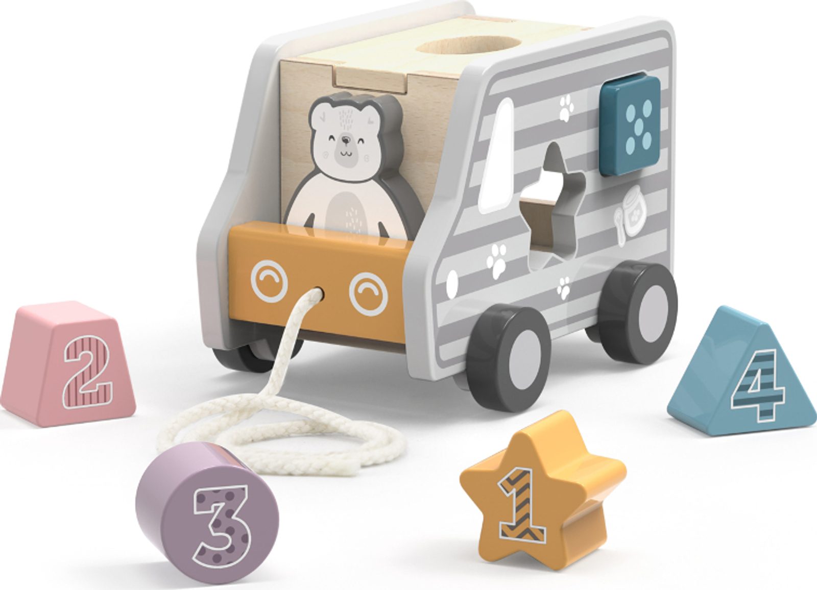 Multifunkční vzdělávací třídička - tahací auto, je hračka, která vašemu dítěti poskytne spoustu zajímavé a kreativní zábavy. Hra zahrnuje přiřazování dřevěných tvarů (hvězda, kruh, ovál, trojúhelník, čtverec a lichoběžník) k otvorům v autě. Čísla se vzory a tečkami natištěnými na prvcích usnadní hraní. Vzdělávací třídička dobře funguje jako pomůcka při rozvoji motoriky batolete a koordinace ruka-oko. Navíc vás naučí rozpoznávat barvy a tvary. Hračka poslouží jak jako náklaďák na provázku - podpoří fyzickou aktivitu, tak i jako třídička kostek.