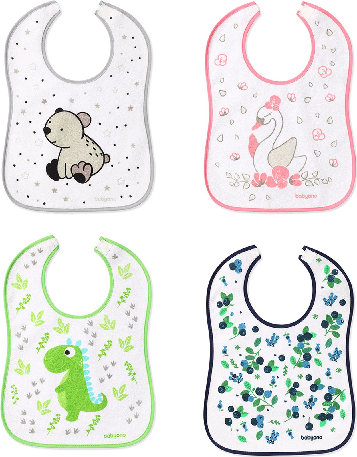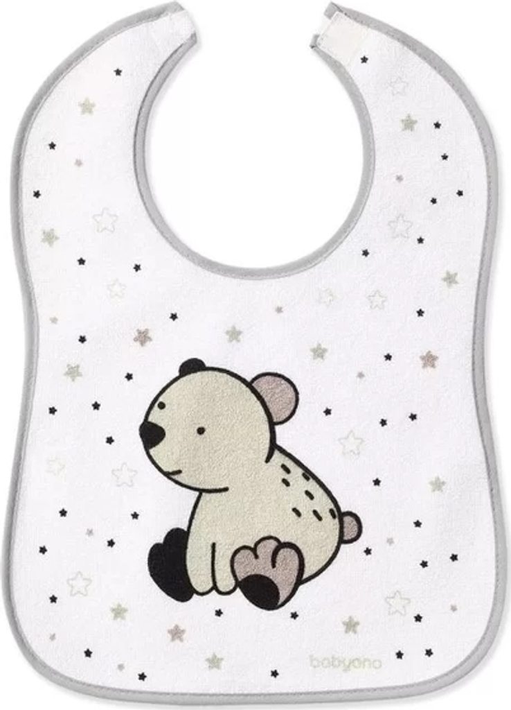 Froté bryndáček je vyroben z vysoce kvalitní froté bavlny. Vnitřní vrstva je podšitá voděodolným materiálem, který navíc chrání oblečení před nečistotami a činí bryndáček voděodolným. Pohodlné a praktické zapínání na suchý zip zvyšuje komfort nošení bryndáku a barevné aplikace zpříjemňují dítěti jídlo.