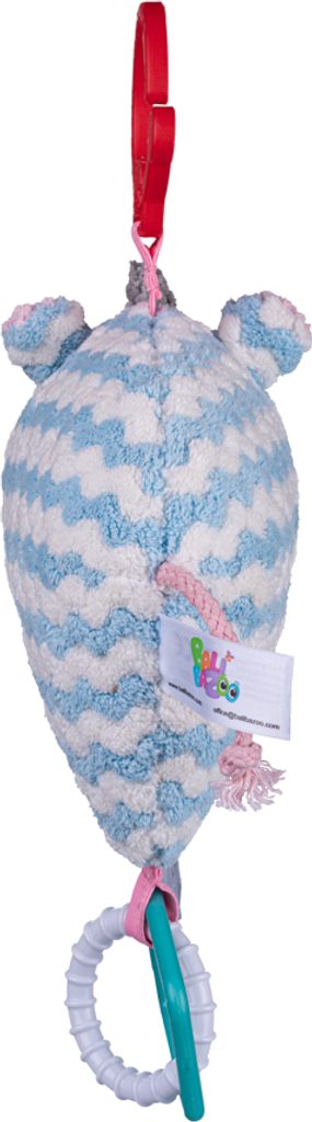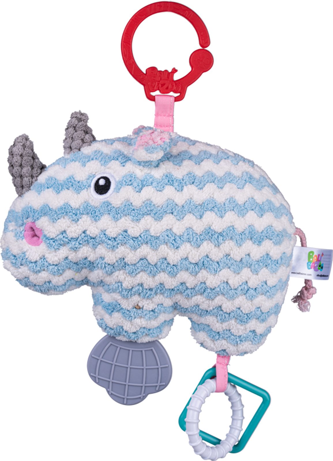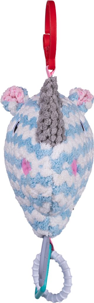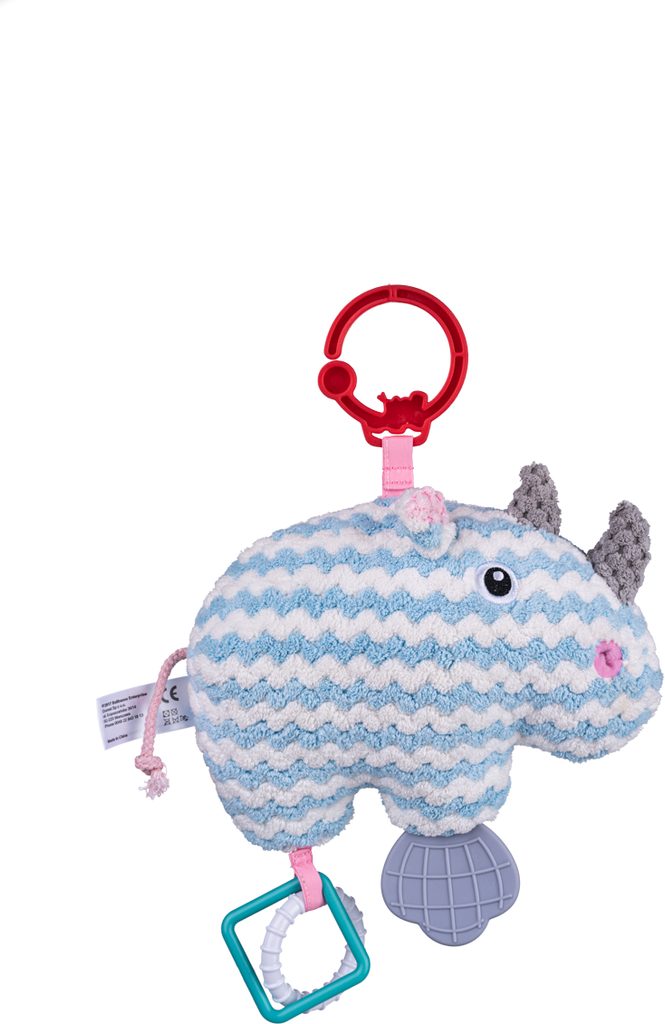 Pastelový kamarád, kterého si jistě zamiluje nejedno miminko. Nosorožec je vybaven 3 kousátky, která přinesou úlevu bolavým dásním kousacího batolete. Uvnitř hračky je zvoneček, díky kterému mazlíček při zatřesení vydává veselý zvuk. Hračka je vyrobena z texturovaného materiálu a stimuluje hmat a zrak dítěte a jeho tlumené barvy mu dodávají jedinečný charakter. Praktický klip vám umožní připevnit hračku na vybrané místo.