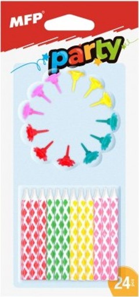 Sada barevných dortových svíček s držákem! Pořiďte oslavenci dortové svíčky, které dozdobí už tak dokonalý dort a splní oslavenci jeho tajné přání! Balení obsahuje: 24 ks barevných svíček (zelená, červená, žlutá, růžová), 12 ks barevných držáků.