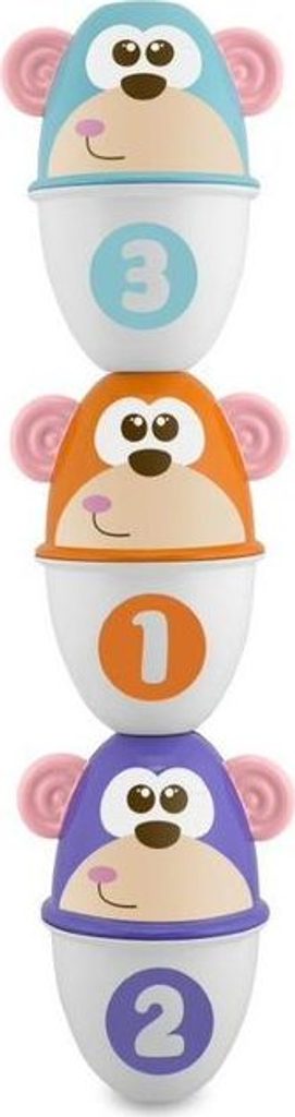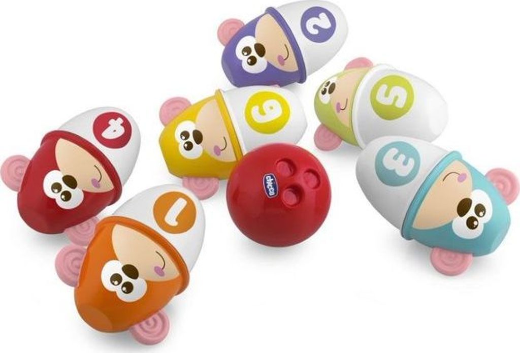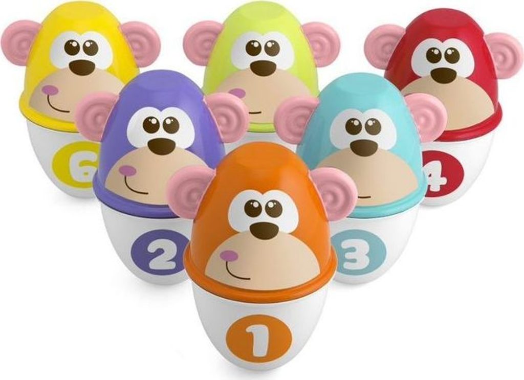 Všechny kuželky jsou navíc očíslovány a zdobeny různými barvami, což podněcuje dítě k tomu, aby se naučilo počítat do 6 a poznávat a kombinovat barvy.