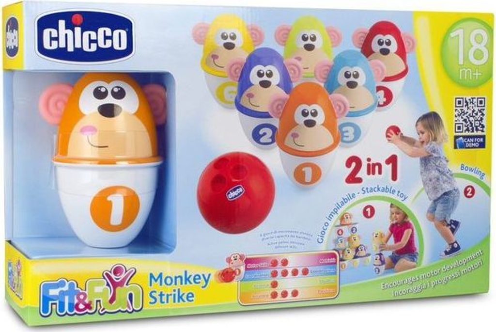 Fit&Fun bowling je první sada bowlingových kuželek pro děti od 18 měsíců, která poskytuje nevšední emoce po každém přesném zásahu 6 barevných, vtipných kuželek s motivy opic.