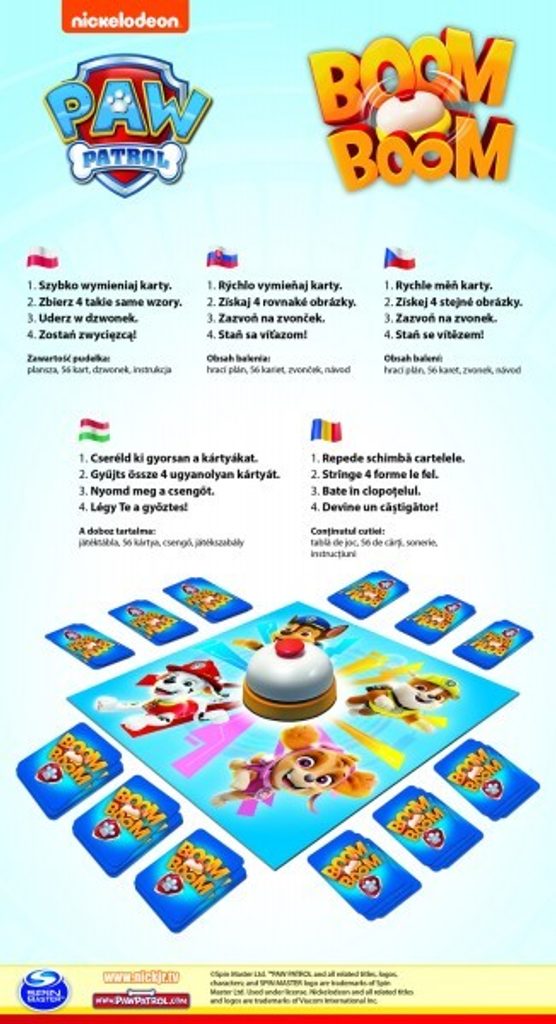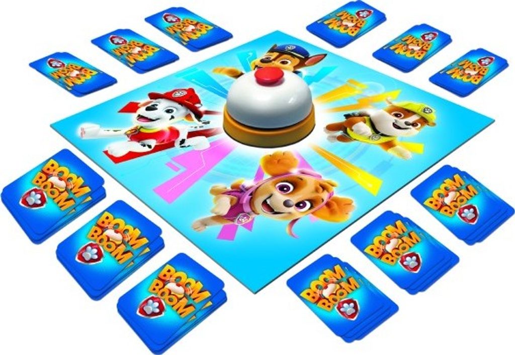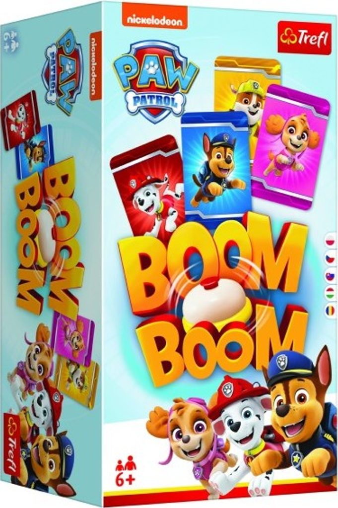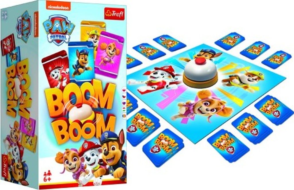 Vytvořte z karet balíček a zazvoňte na zvonek! Abyste vyhráli, musíte nasbírat kompletní sérii karet s postavami ze seriálu Tlapková patrola. Boom Boom - Paw Patrol je dynamická rodinná hra, ve které záleží na obratnosti, vnímavosti a dobrých reflexech. V Boom Boom se hráči snaží sbírat sady stejných pohádkových postav. Hráči si současně vyměňují své karty s kartami na hrací ploše. Poté, co hráč získá 4 stejné postavy, zazvoní na zvonek a signalizuje sbírku připravené hromádky.