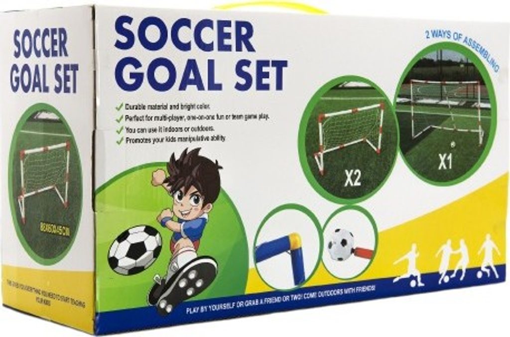 Sportovní sada na fotbal pro všechny malé fotbalisty! Spousta zábavy na zahradu. Postav branku, natáhni síť, nafoukej míč a zápas může začít. Je možné sestavit 1 velkou branku nebo 2 branky menší,v balení jsou 3 sítě.