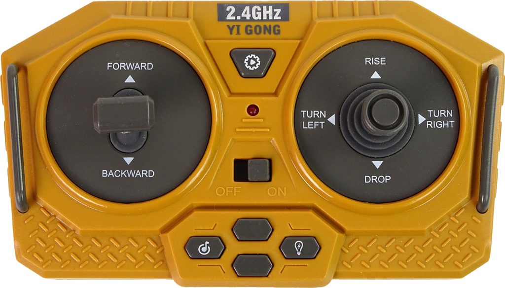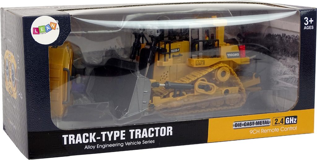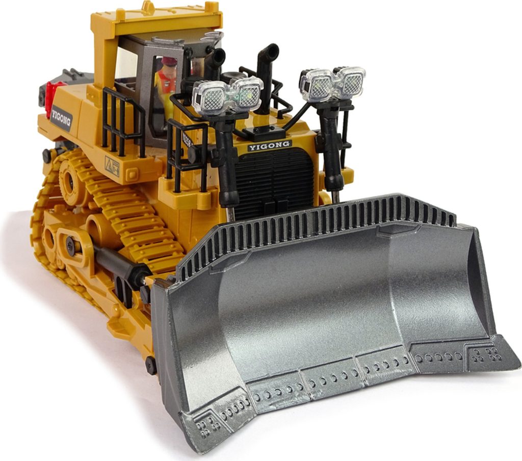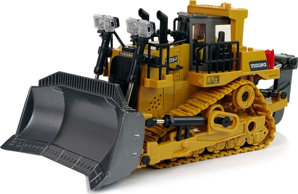 Dálkově ovládaný buldozer je realisticky reprodukovaný model. Žlutou kopuli zdobí černé detaily a charakteristické polepy. Dálkové ovládání má frekvenci 2,4 Ghz a vozík je vyroben v měřítku 1:20. Ovládání dálkového ovladače R/C je velmi jednoduché, dva joysticky umožňují pohodlné manévrování. S jeho pomocí může obsluha buldozeru měnit směr jízdy vpřed/vzad a vpravo/vlevo, upravovat hlasitost a především pohybovat lžící.