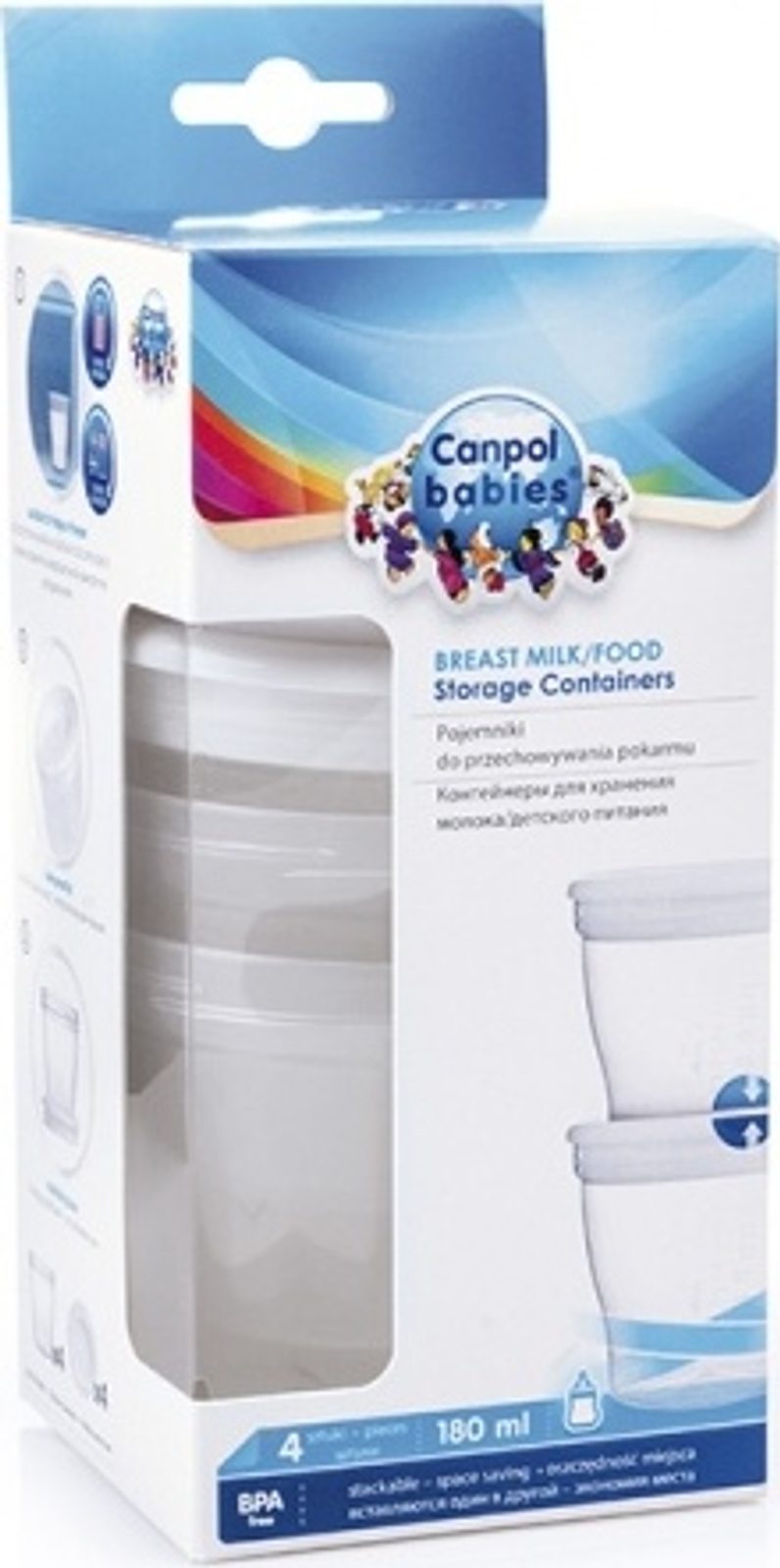 Zásobníky s víčkem od Canpol babies jsou praktickým doplňkem každé maminčiny výbavy. Byly speciálně vytvořeny pro tak, aby umožnily praktické uchovávání pokrmů, odsátého mléka či jiných tekutin. Objem jednoho zásobníku činí 180ml a v balení se nachází 4 ks. Zásobníky jsou určeny k uchovávání pokrmů v ledničce nebo mrazničce. Umožňují dlouhodobě udržet nejvyšší kvalitu uchovávaných potravin. Jsou vyrobeny z materiálu určeného pro styk s potravinami.