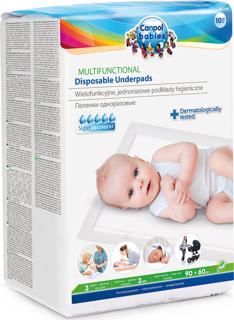Jednorázové hygienické podložky chrání matraci před znečištěním. Jsou ideální pro ženy v období po porodu. Jsou vhodné jako ochrana matrace v dětské postýlce, když se dítě učí používat nočník. Podložky můžete použít i při přebalování kojenců. V balení 10 kusů. Rozměr: 60 x 90 cm, tloušťka 2 mm, obsahují 9 vrstev.