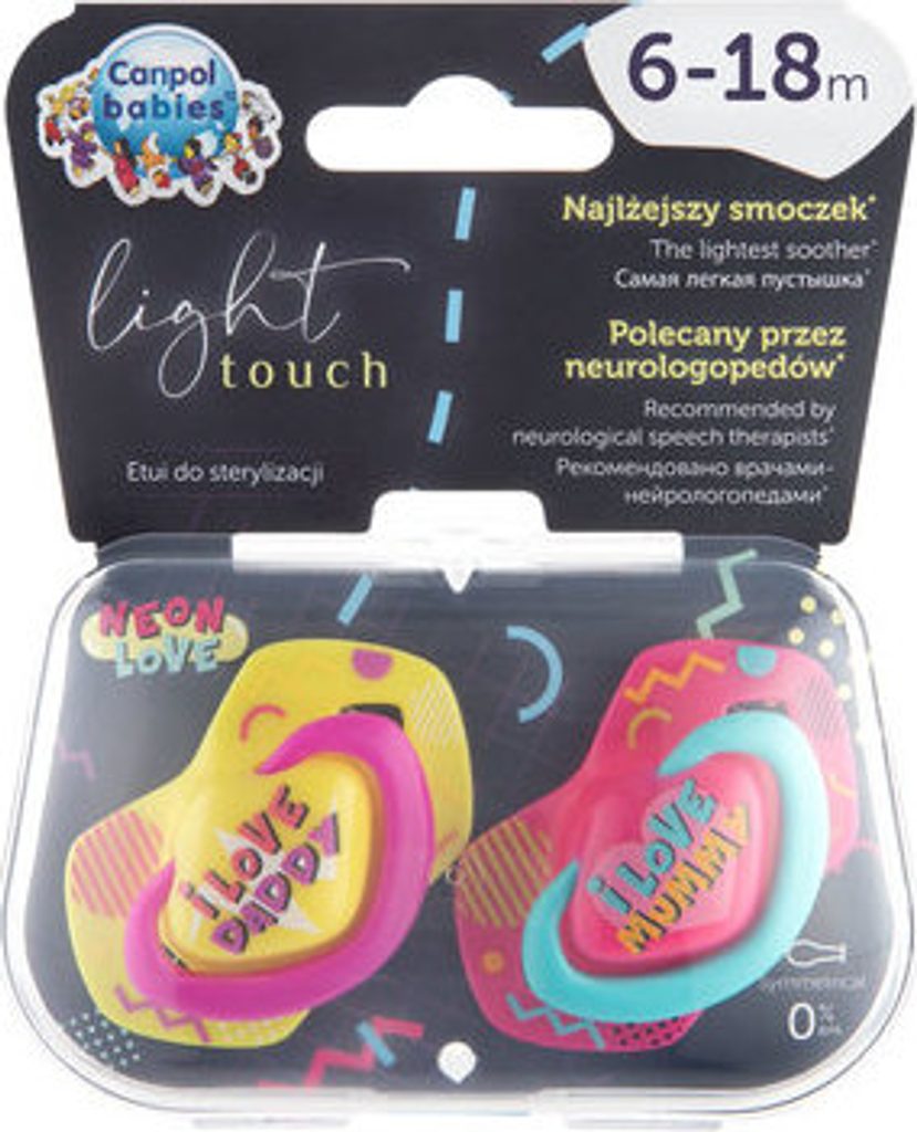 Canpol Babies Canpol Babies 2 ks symetrických silikonových dudlíků, 6-18m, Neon Love Baby, růžovo, žluté