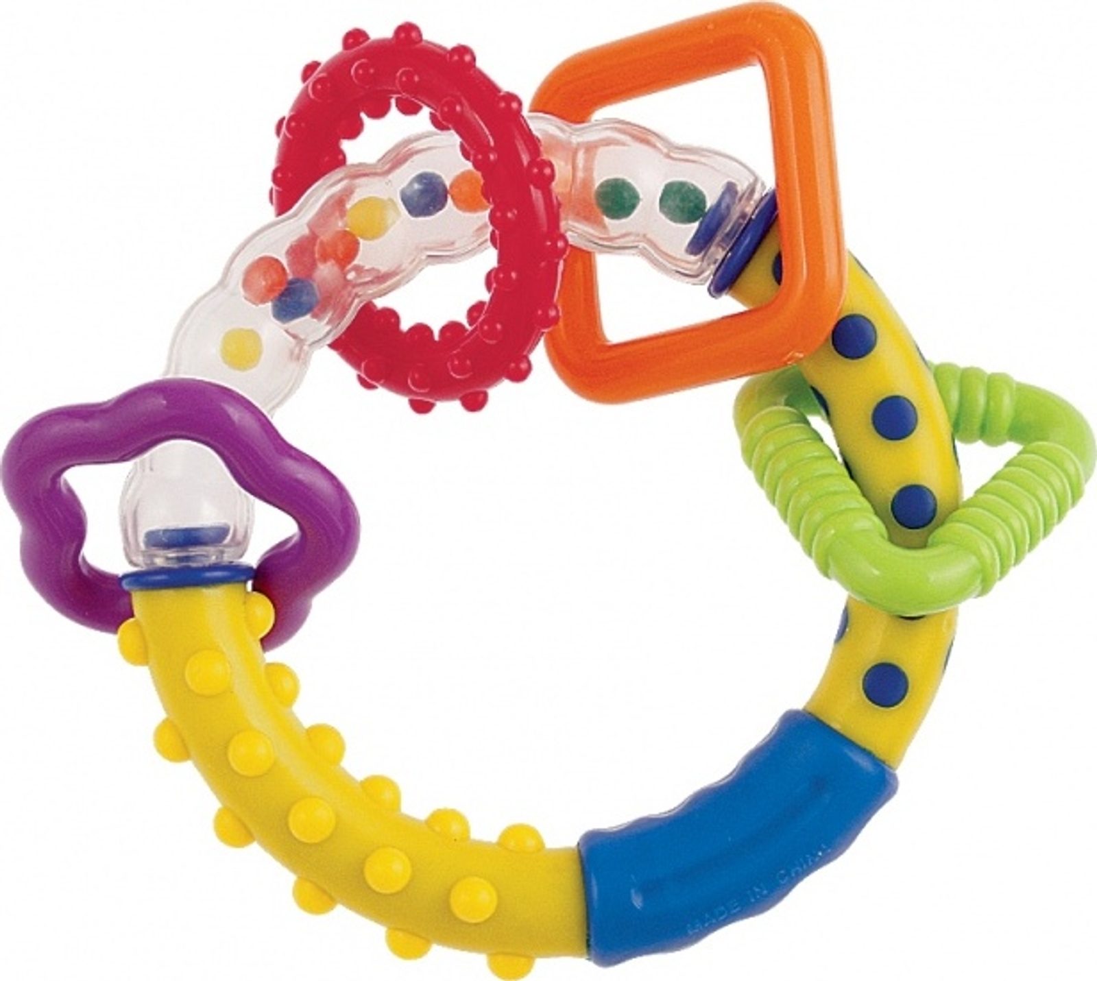 Atraktivní tvary a intenzivní barvy zaujmou pozornost dítěte a podporují vývoj jeho smyslů. Chrastítko je vyrobeno z bezpečných materiálů bez ostrých hran.