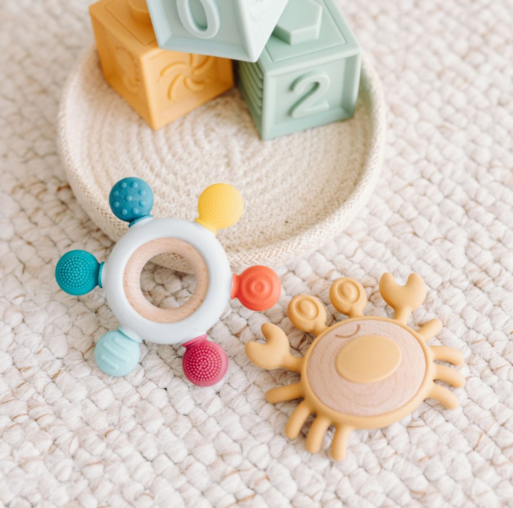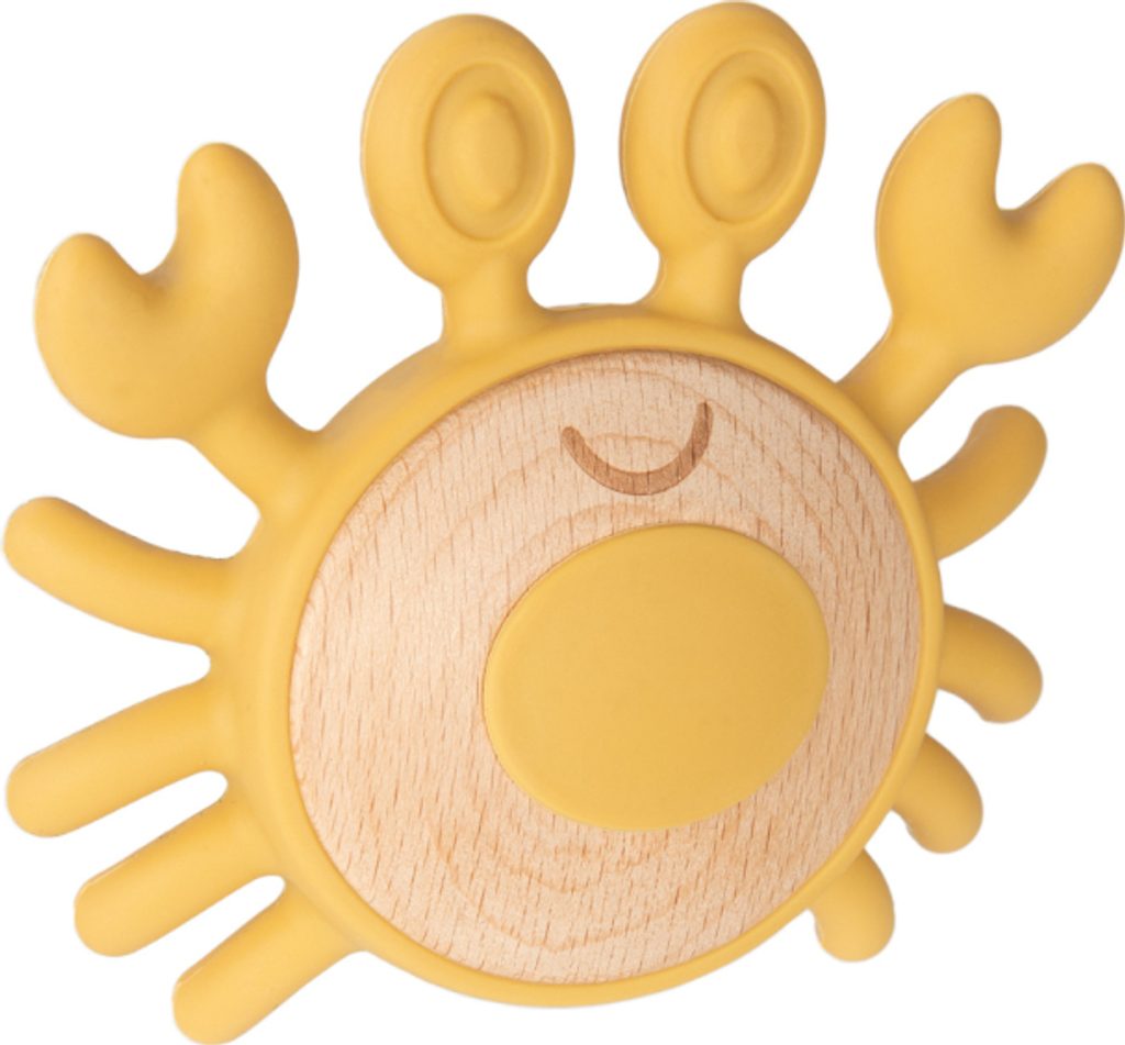Dřevo-silikonové kousátko KRAB je perfektní první hračkou pro miminka a nenahraditelnou oporou v těžké době prořezávání zoubků pro nejmenší miminka. Kousátko stylovým způsobem kombinuje přírodní bukové dřevo a bezpečný silikon. Díky různorodé struktuře a tvrdosti materiálů se skvěle hodí, když miminko velmi svědí dásně a dítě má silnou potřebu kousat.