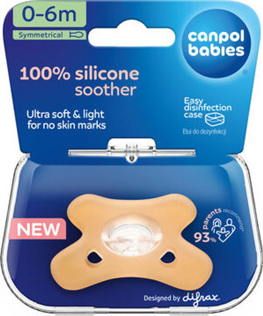 100% silikonový symetrický dudlík Canpol babies je výjimečně měkký a lehký, neobtiskává se na obličeji dítěte. Hygienický a bezpečný - snadno se udržuje v čistotě.