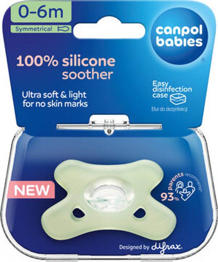 100% silikonový symetrický dudlík Canpol babies je výjimečně měkký a lehký, neobtiskává se na obličeji dítěte. Hygienický a bezpečný - snadno se udržuje v čistotě.