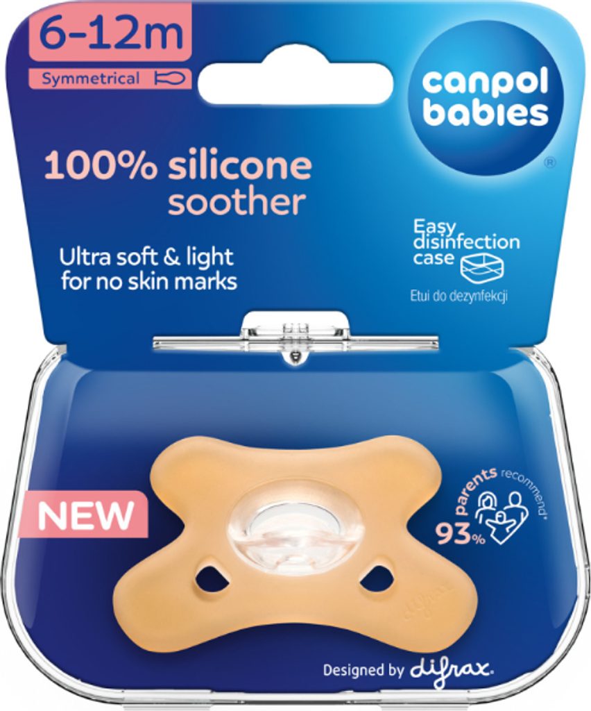 100% silikonový symetrický dudlík Canpol babies je výjimečně měkký a lehký, neobtiskává se na obličeji dítěte. Hygienický a bezpečný - snadno se udržuje v čistotě.