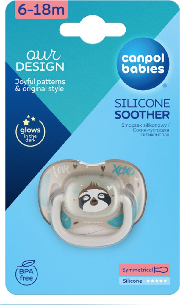 Canpol babies symetrický silikonový dudlík 6-18m EXOTIC ANIMALS (lenochod) je pevný a odolný vůči deformaci. Bez BPA. Tento dudlík je bezpečný a snadno se udržuje v čistotě – lze jej dezinfikovat ve vroucí vodě a ve sterilizátoru. Symetrický dudlík se dobře přizpůsobí ústům dítěte bez ohledu na způsob jeho umístění a jeho tvar je považován za nejfyziologickější, podporuje zachování přirozeného rytmu sání a správný vývoj řeči. Dudlík doporučený pro děti ve věku 6-18 měsíců. Canpol babies symetrický silikonový dudlík 6-18m EXOTIC ANIMALS (lenochod) je dostupný v několika jedinečných designech a různých velikostech – roste s dítětem.