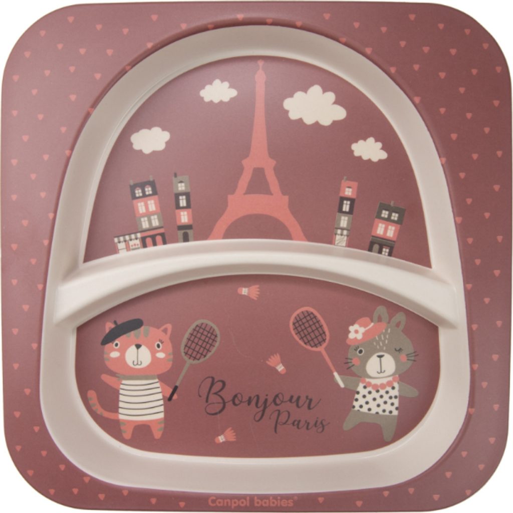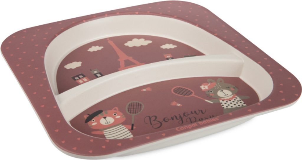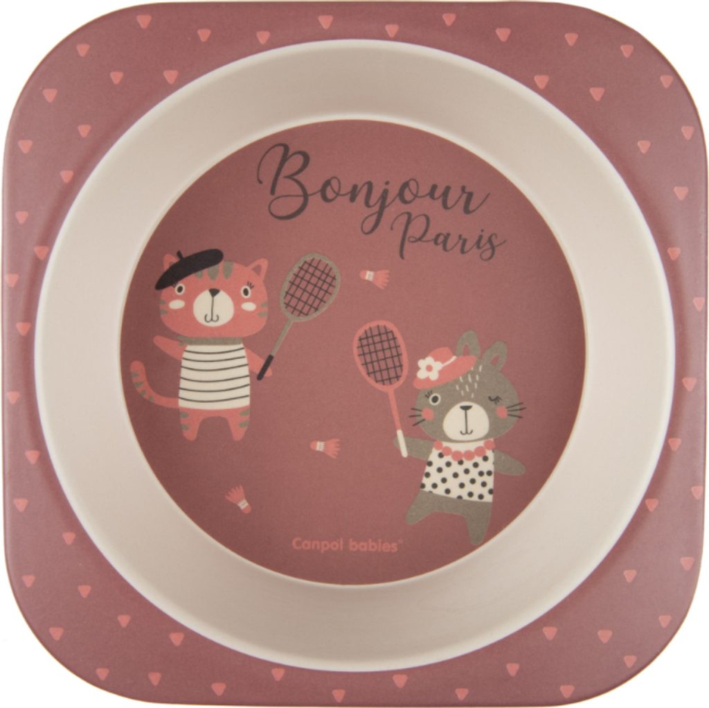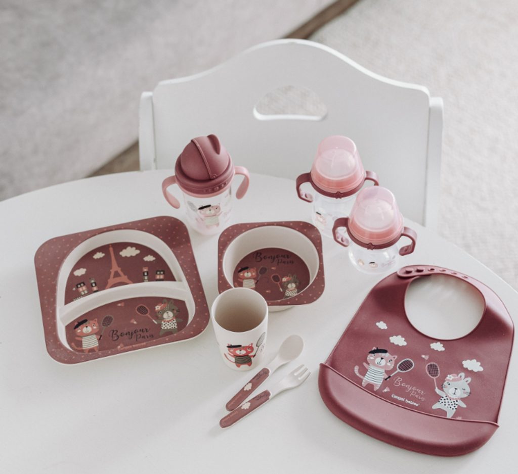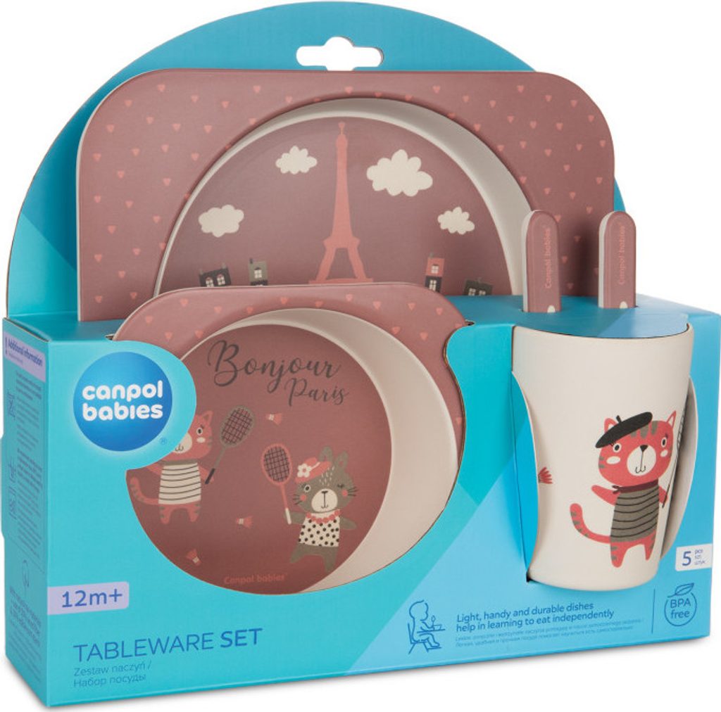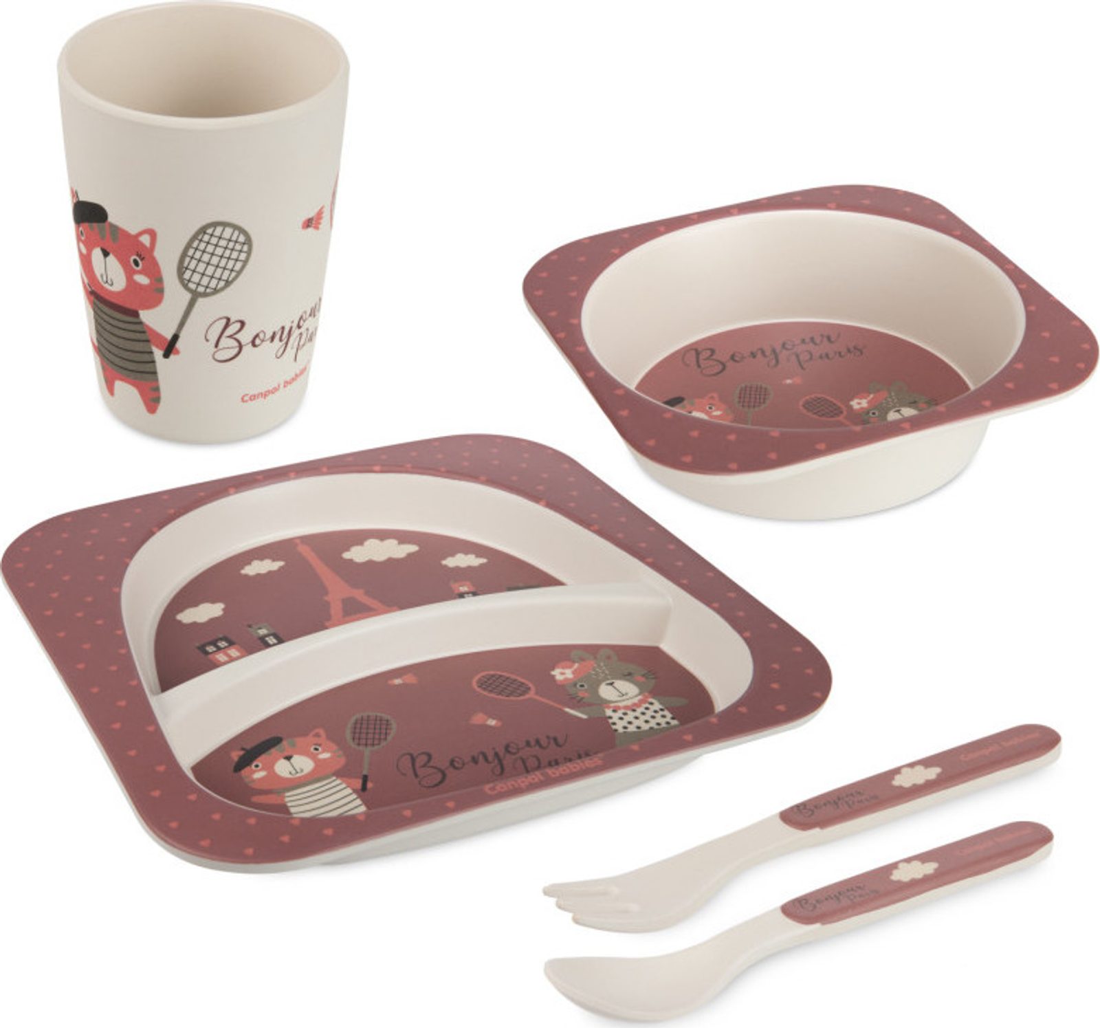 Sada nádobí BONJOUR PARIS je ekologickou alternativou klasických talířů a misek z plastu. Sada nádobí je vyrobena z pevného, odolného, nerozbitného materiálu vhodného pro styk s potravinami, za použití přírodních surovin – 50 % dřevitých vláken a 30 % kukuřičného škrobu (a 20 % melaminové pryskyřice).Sada obsahuje: talíř, misku, hrnek a příbor – vidličku a lžíci. Příbor má zaoblené hrany, díky čemuž je bezpečný pro dětská ústa a jemné dásně. Sada dětského nádobí BONJOUR PARIS s roztomilými potisky povzbudí vaše dítě k jídlu. Sada dětského nádobí Canpol babies z kolekce BONJOUR PARIS je ideální pro děti od 12 měsíců, které se učí samy jíst a pít. Lze mýt v myčce za použití nebarvených tablet do myčky a jemných mycích prostředků. Sada nádobí pro miminka BONJOUR PARIS se bude skvěle hodit doma, na dovolené nebo na pikniku.