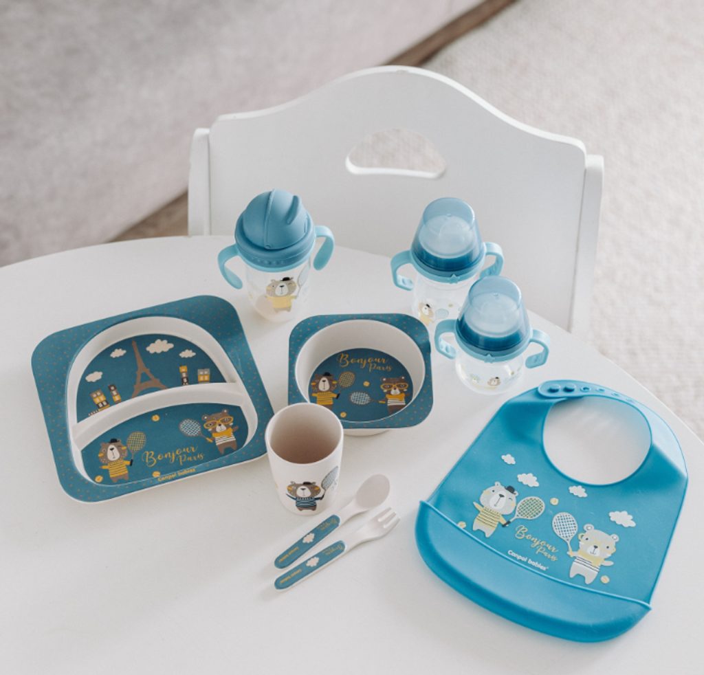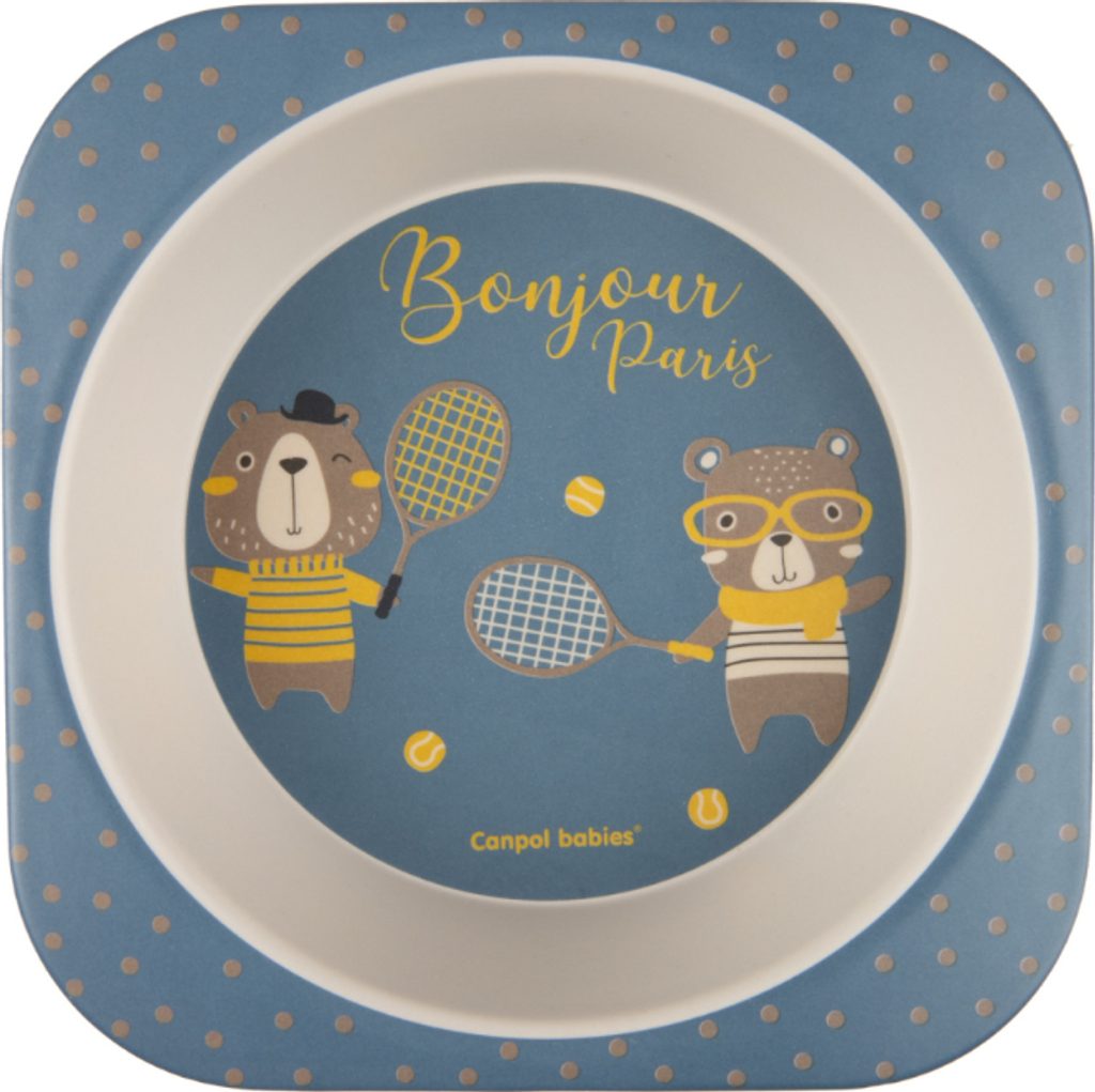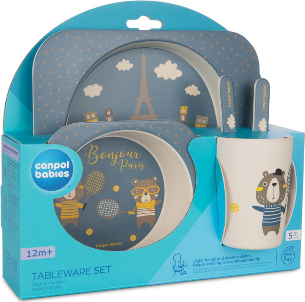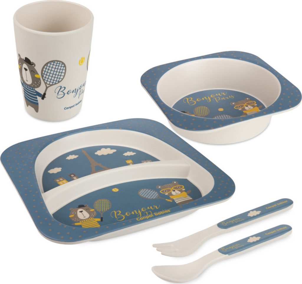 Sada nádobí BONJOUR PARIS je ekologickou alternativou klasických talířů a misek z plastu. Sada nádobí je vyrobena z pevného, odolného, nerozbitného materiálu vhodného pro styk s potravinami, za použití přírodních surovin – 50 % dřevitých vláken a 30 % kukuřičného škrobu (a 20 % melaminové pryskyřice).Sada obsahuje: talíř, misku, hrnek a příbor – vidličku a lžíci. Příbor má zaoblené hrany, díky čemuž je bezpečný pro dětská ústa a jemné dásně. Sada dětského nádobí BONJOUR PARIS s roztomilými potisky povzbudí vaše dítě k jídlu. Sada dětského nádobí Canpol babies z kolekce BONJOUR PARIS je ideální pro děti od 12 měsíců, které se učí samy jíst a pít. Lze mýt v myčce za použití nebarvených tablet do myčky a jemných mycích prostředků. Sada nádobí pro miminka BONJOUR PARIS se bude skvěle hodit doma, na dovolené nebo na pikniku.