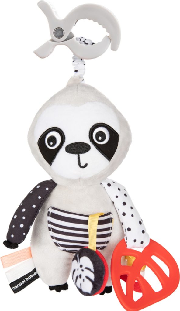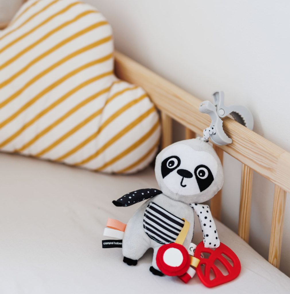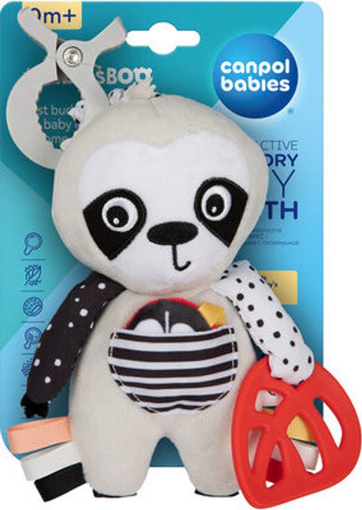 Senzorická interaktivní závěsná hračka LENOCHOD s klipem BabiesBoo bude skvělým společníkem na procházky a cestování. Má pohodlnou sponu, která ji umožňuje připevnit na dětský kočárek, autosedačku, postýlku a jako doplňkový prvek ke smyslově vzdělávací hrací podložce Canpol babies. Doplňkové šustící prvky, kousátko, zrcátko a jemně zvonící chrastítko jsou pro dítě zajímavé v době poznávání světa. Lenochod byl vyroben z měkkých a příjemných materiálů – plyš, manšestr, tlapky plněné "hráškem", našité barevné visačky zajišťují smyslové zážitky. Dítě se prostřednictvím citlivosti doteku naučí různým strukturám. Kontrastní barvy a vzory podporují správný vývoj zraku miminka. Lenochod má na přední straně kapsu, kam se zrcátko připevněné na pásku schove nebo jiné drobné poklady – např. žalud nalezený na procházce. Interaktivní senzorická hračka Canpol babies bude vaše miminko doprovázet u každodenních dobrodružstvích od prvního dne života a budou společně objevovat svět. Přátelská interaktivní senzorická hračka LENOCHOD s klipem BabiesBoo zabaví, naučí relaxovat – je to dokonalý společník pro každodenní hry, procházky a cestování.