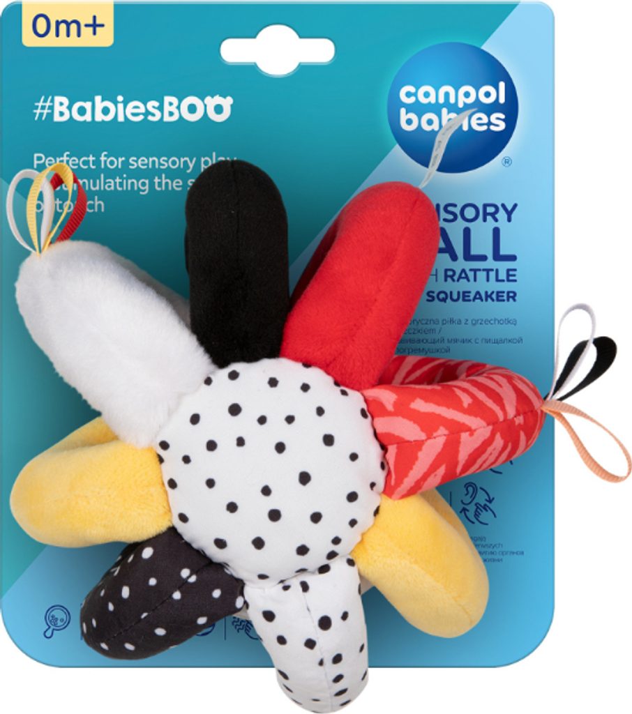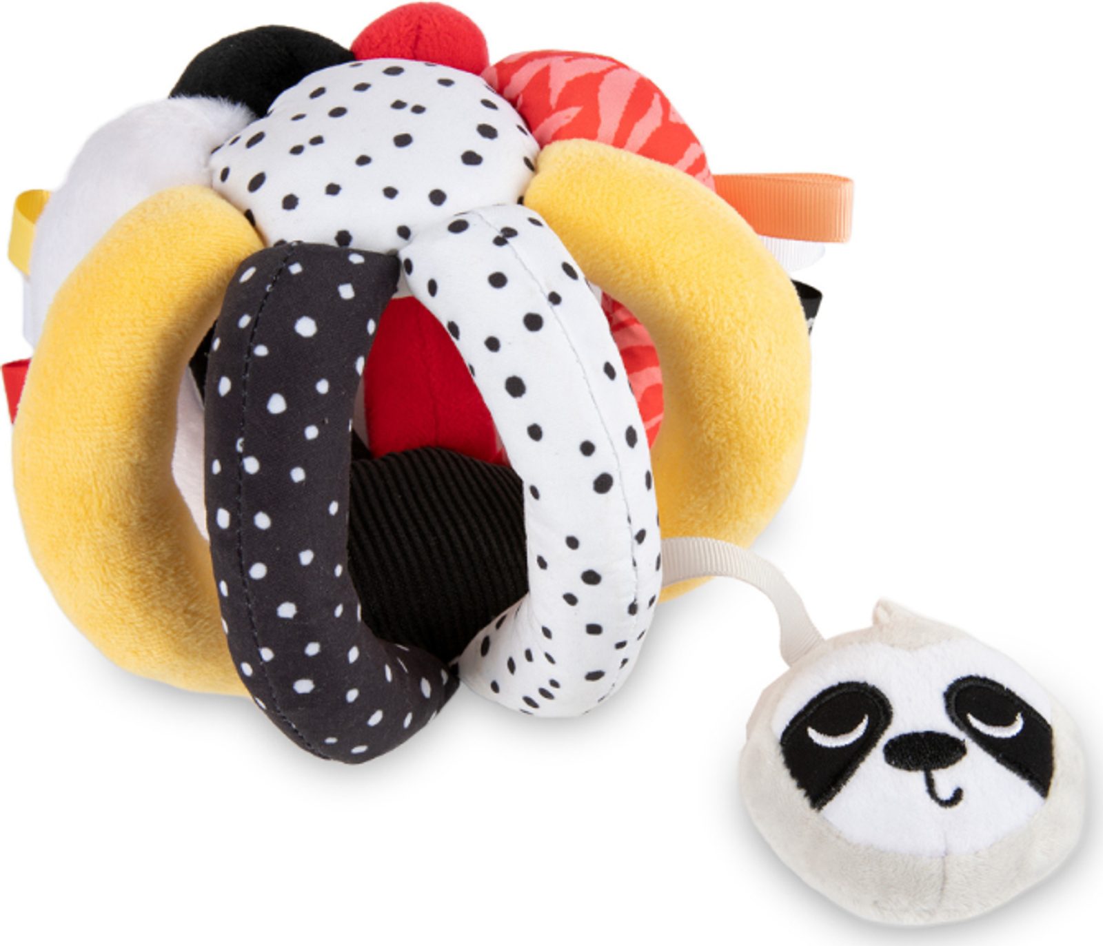 Senzorický míček LENOCHOD s chrastítkem a pískátkem BabiesBoo je ideální pro koulení, chytání, házení, což trénuje obratnost a koordinaci. Měkký míč umožňuje dítěti objevovat mnoho smyslových rysů – šustění, vrzající prvky, barevné visačky a různé textury, které jsou pro dítě zajímavé v době poznávání světa. Míč má chrastítko, které je schované uvnitř a při hraní vydává jemné zvuky, které vybízí miminko k prolézání. Senzorický míček Canpol babies je lehký, pohodlný na uchopení, přizpůsobený malým dětským ručkám, ideální pro mačkání, ohýbání a kousání. Tvář lenochoda na stuze má na jedné straně otevřené oči na druhé straně spí, což pomáhá ke všimnutí si rozdílů a po stisknutí vydává zajímavý zvuk. Díky visačkám a jeho konstrukci se dá snadno uchopit nebo připevnit. Senzorický míček Canpol babiespro miminka je ideální smyslová hra, podporuje rozvoj sluchově-motorické koordinace, cvičení zraku, hmatu a vnímání motoriky.