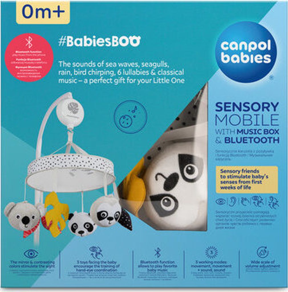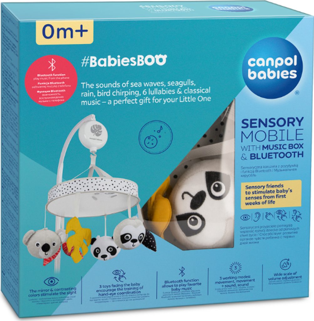 Unikátní a moderní Senzorický plyšový kolotoč s melodiemi/bluetooth BabiesBoo do dětské postýlky zaujme miminko během dne a vytvoří útulnou a klidnou atmosféru pro spánek. Kolotoč hraje 60 minut nepřerušované melodie a po uplynutí této doby se automaticky vypne – 11 melodií: bílý šum, zvuky mořských vln a létajících racků, déšť, lesní hluk a zpěv ptáků, 6 ukolébavek a klasická Mozartova hudba. Zařízení s funkcí Bluetooth vám umožní zapnout oblíbené melodie a pohádky z aplikace na vašem mobilním telefonu. Kolotoč má 3 provozní režimy: pohyb, pohyb a hudba nebo pouze hudba a široký rozsah nastavení hlasitosti – snadno jej přizpůsobíte preferencím vašeho miminka. Canpol babies senzorický kolotoč má speciálně profilovanou čelenku, díky které jej lze snadno a stabilně připevnit na rám dětské postýlky. Na kolotoči je 6 různých hraček, z nichž 3 roztomilá zvířátka koukají na miminko. Kontrastní barvy – bílá a černá v kombinaci se žlutou a červenou barvou upoutají pozornost dítěte a podněcují fantazii. Na celé ploše spodního části je zrcadlo, ve kterém dítě vidí svou tvář, vzbuzuje jeho zvědavost a zájem. Přívěsky připevněné na mobilu a velké zrcátko vybízejí dítě k natahování rukou směrem k nim, což podporuje rozvoj jeho svalů a zapojuje zrak. Trénuje koordinaci oko-ruka. Senzorický kolotoč Canpol babies s hudebním boxem a Bluetooth BabiesBoo je perfektní tip na dárek pro novorozence nebo pro miminko.
