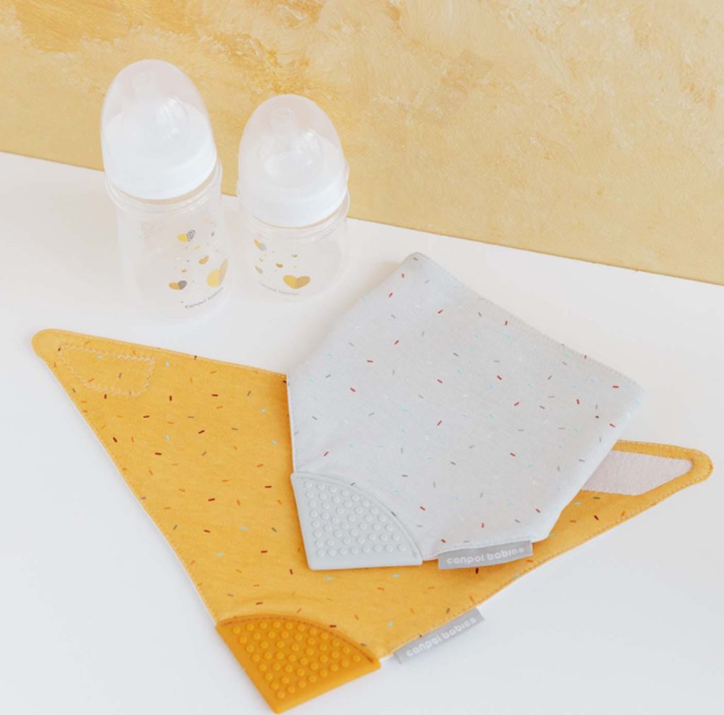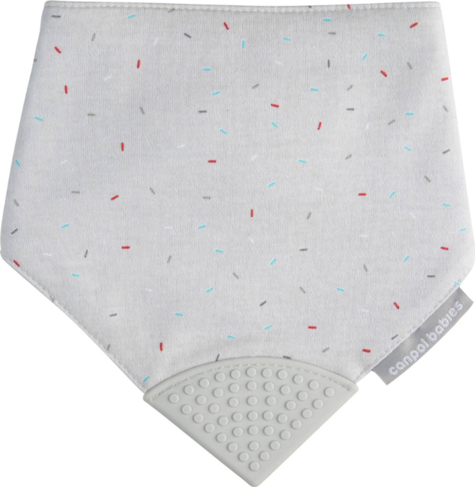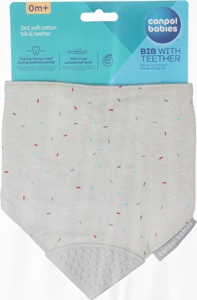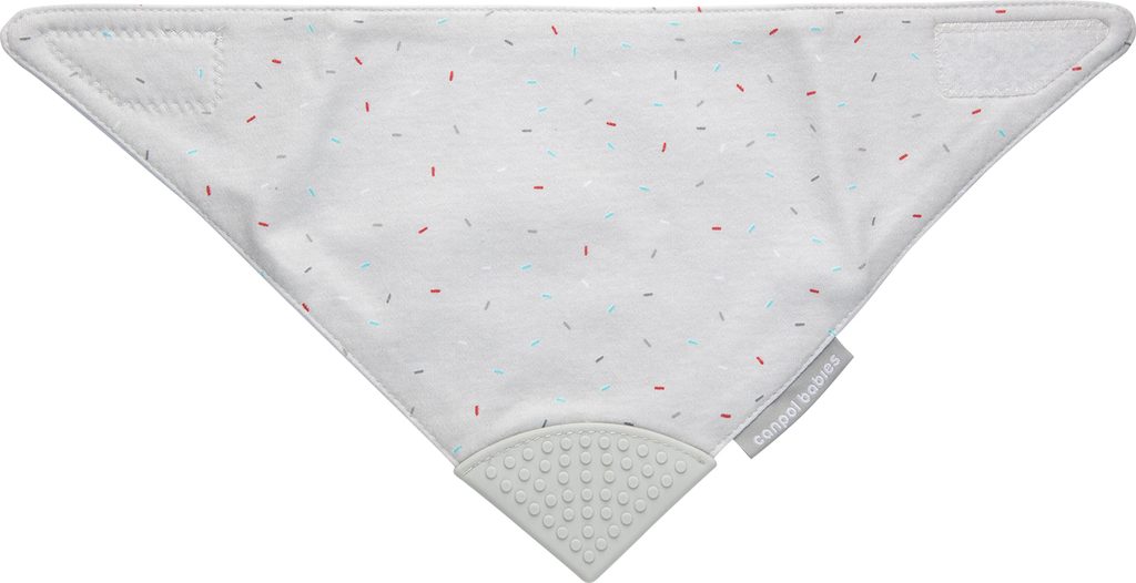Látkový slintáček s kousátkem je perfektním řešením pro prořezávání zoubků. Slintáček je vyroben z měkké bavlny s vnitřní voděodolnou vrstvou, díky které pomůže udržet oblečení suché a čisté i při silném slintání. Kousátko je vyrobeno z měkkého, bezpečného a odolného silikonu, který přinese úlevu citlivým a svědivým dásním vašeho miminka. Látkový slintáček s kousátkem lze díky suchému zipu přizpůsobit krku dítěte. Lze prát v pračce.