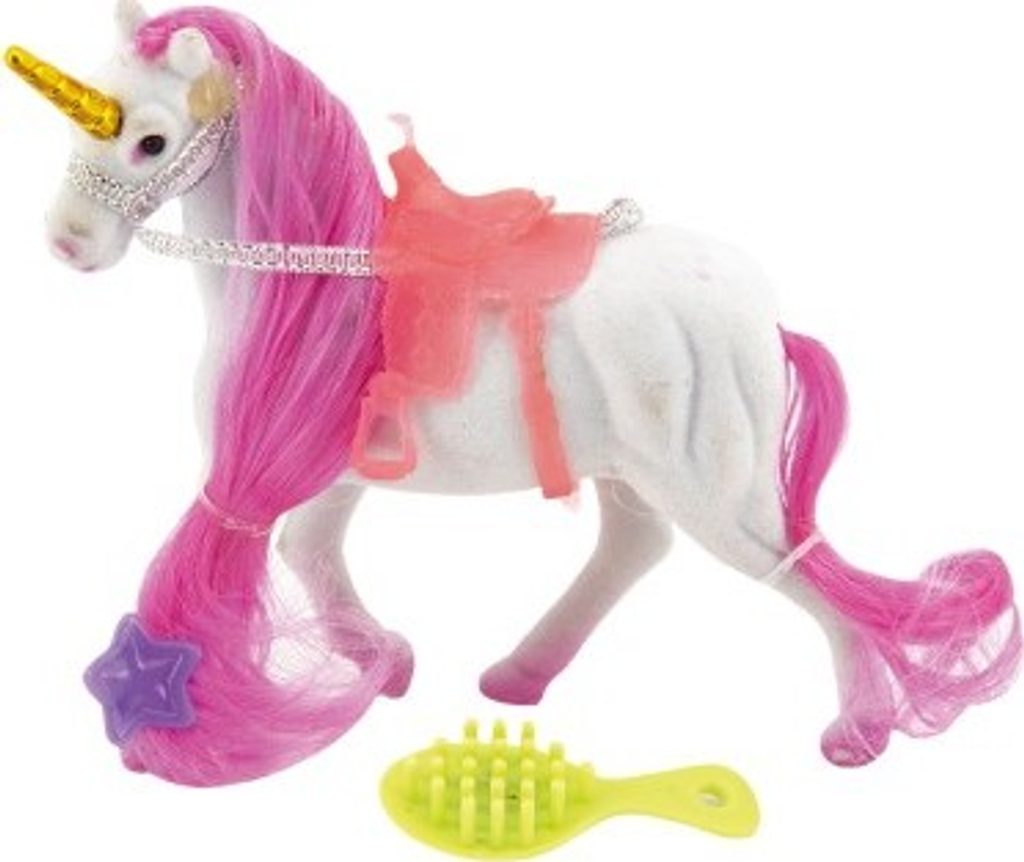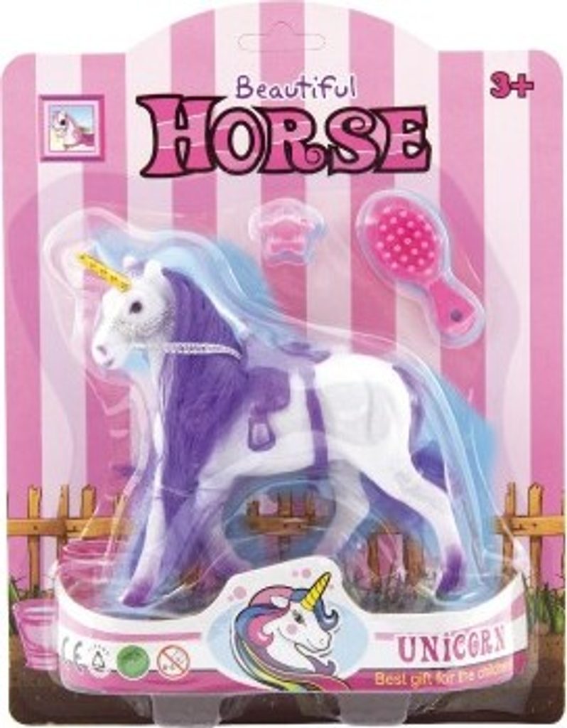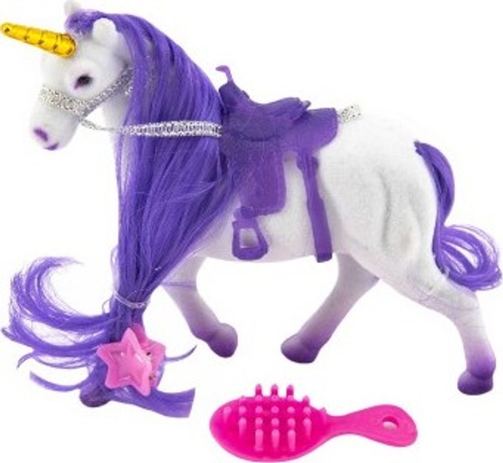 Krásný jednorožec v sadě s hřebenem a sponkou. Jednorožec má krásnou hřívu a ocas, který můžete česat. Ideální dárek pro všechny obdivovatele a milovníky koní. Jednorožec je plastový s povrchovou úpravou fliška.