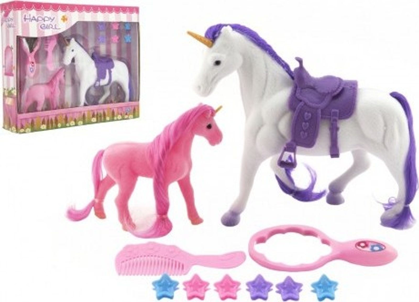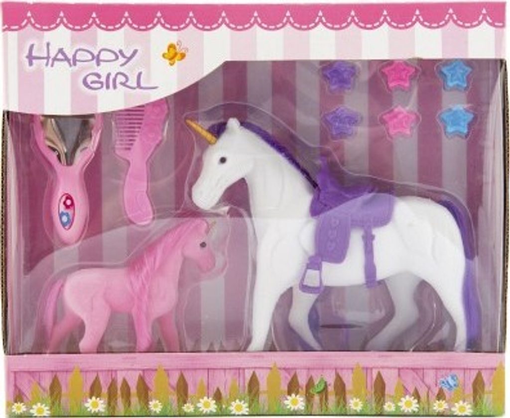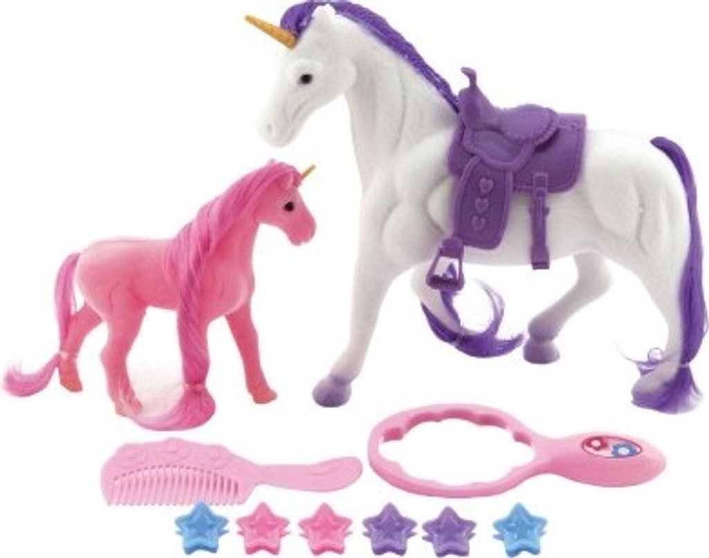 Jednorožec je bájné zvíře, které dokáže zázraky. Proto je také potřeba, aby o něj bylo dobře postaráno a aby jeho hříva byla vždy krásně učesaná. Jednorožec se sedlem pro všechny obdivovatele a milovníky koní. Kůň/jednorožec je plastový, s povrchovou úpravou fliška. V balení také naleznete hříbátko jednorožce též s povrchovou úpravou fliška. Součástí balení jsou doplňky jako zrcátko, či hřebínek a ozdoby do hřívy. Figurky využijete například při hraní na vaší farmě. Jednorožce můžete česat dle své vlastní fantazie.
