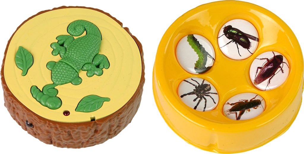 Chameleon na dálkové ovládání Green Light 28 cm Tento dálkově ovládaný zelený chameleon je vyroben z kvalitního plastu, který zaručuje odolnost a dlouhodobé používání. Ovládání probíhá pomocí dálkového ovladače v podobě tvarově napodobeniny dřevěného kmene s tlačítky v podobě malého chameleona a listů. Dálkově ovládaný chameleon se může pohybovat dopředu, dozadu, doleva a doprava – to vše díky různým částem chameleonova těla na dálkovém ovladači. Ale to není všechno! Záda chameleona září pěti různými barvami, které lze vybrat pomocí levého listu na dálkovém ovladači. Chameleon umí pohybovat očima a ocasem a má také fascinující funkci vyplazování jazyka k chytání hmyzu - ovládání se provádí pomocí pravého listu na dálkovém ovladači. Součástí sady jsou také plastová kolečka na talíři s obrázky hmyzu, který můžete házet a chytat pomocí chameleonova jazyka. Chameleon vyžaduje 4 x 1,5 V AA baterie a dálkový ovladač funguje na 2 x 1,5 V AAA baterie (baterie nejsou součástí balení).