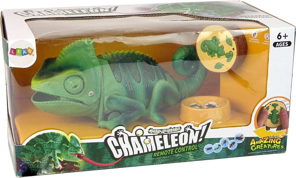 Dálkově ovládaný zelený chameleon vyrobený z odolného plastu. Chameleon umí pohybovat očima a ocasem a má také fascinující funkci vyplazování jazyka k chytání hmyzu.