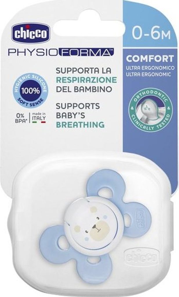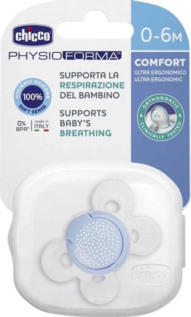 Dudlík Chicco Physio Comfort řady Physioforma patří mezi aktivní ortodontické uklidňující dudlíky. Kotouč dudlíku Physio Comfort byl speciálně navržen tak, aby byl co nejmenší možnou styčnou plochou s dětskou tvářičkou a poskytl i té nejcitlivější pokožce se sklonem k podráždění maximální komfort.