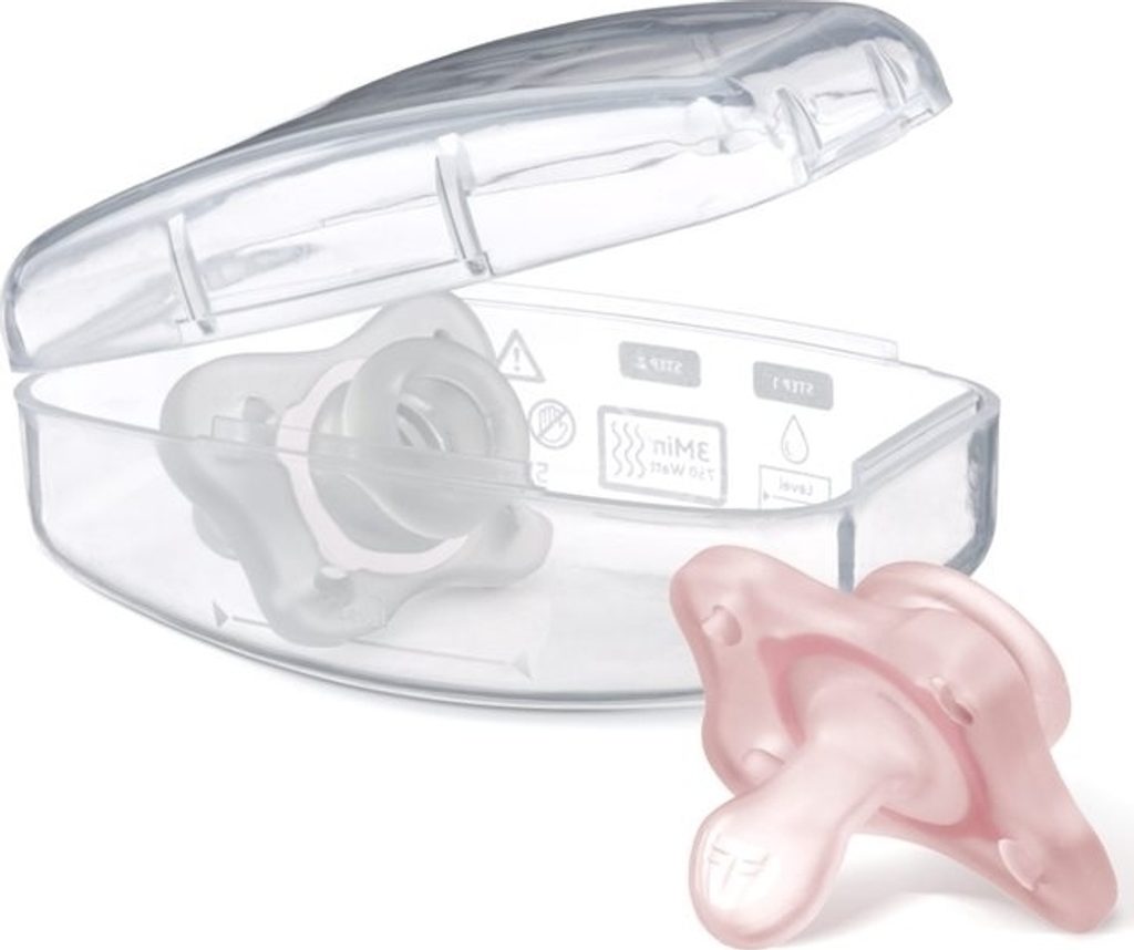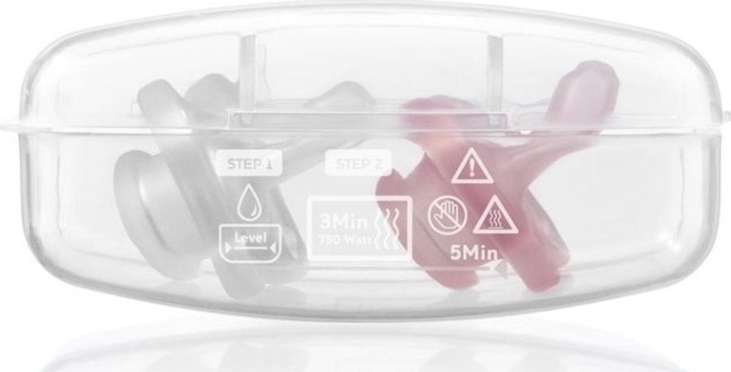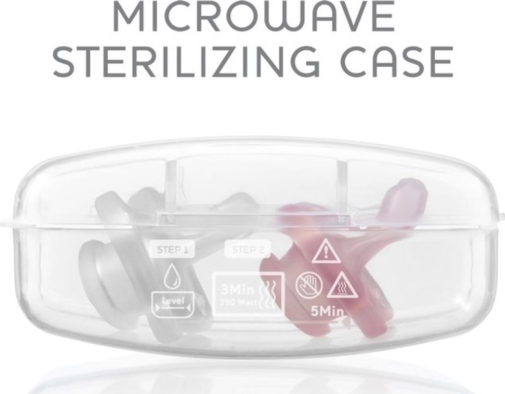 Dudlíky jsou baleny ve sterilizačním pouzdře, které můžete mít stále u sebe a pomocí pouzdra v mikrovlnce za 3 minuty dudlíky vysterilizovat.