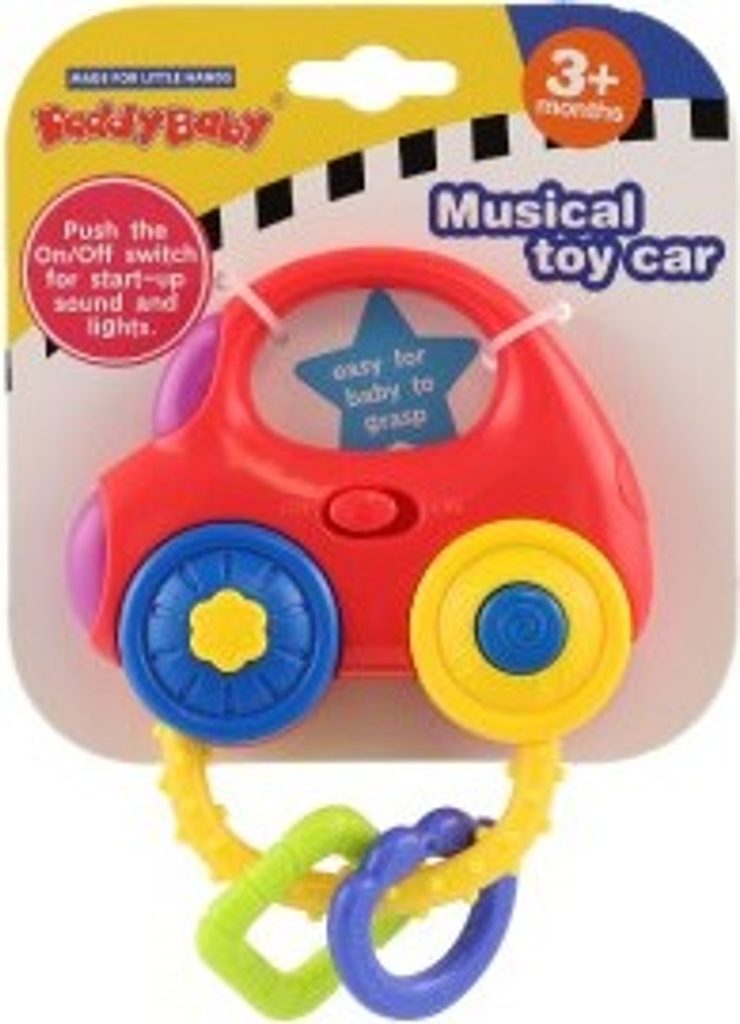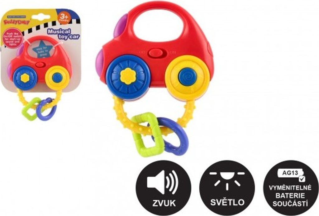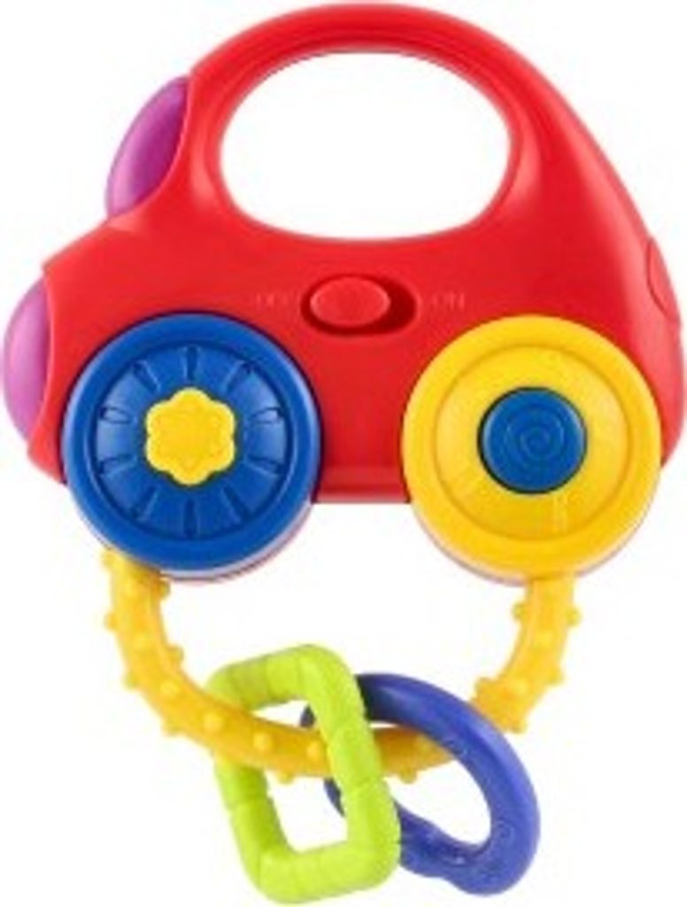Barevné dětské chrastítko ve tvaru auta se díky svým veselým barvám stane velmi oblíbeným u nejmenších. Chrastítko po zmáčknutí tlačítek bliká, hraje melodie a vydává zvuky startujícího, jedoucího či troubícího auta.