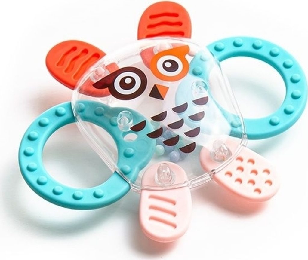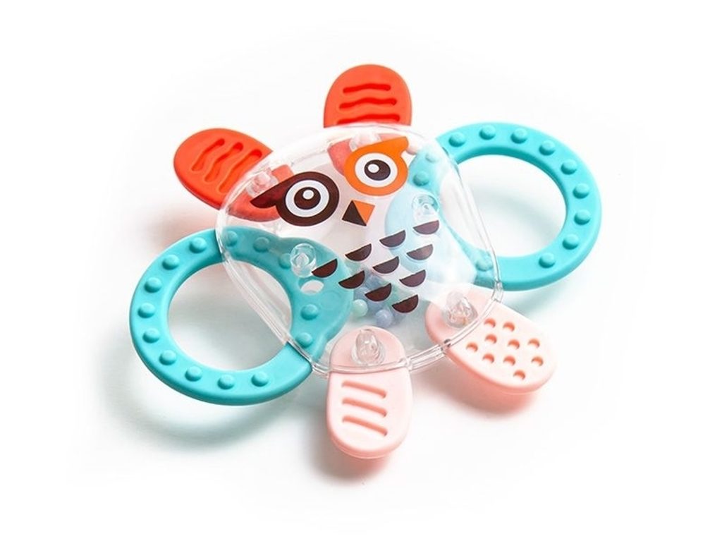 Chrastítka s kousátkem má silikonové prvky bezpečné pro vaše batole. Chrastítko bylo určeno zejména pro nejmenší děti. Z trvanlivých a bezpečných materiálů. Nemá ostré hrany. Produkt zcela bez bisfenolu A (0% BPA). Díky zajímavým barvám podporuje rozvoj vizuální koordinace dítěte. Speciálně vybraný tvar činí chrastítko-kousátko dobře držitelným.