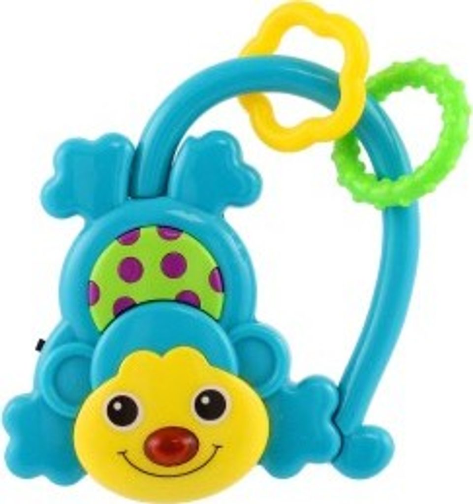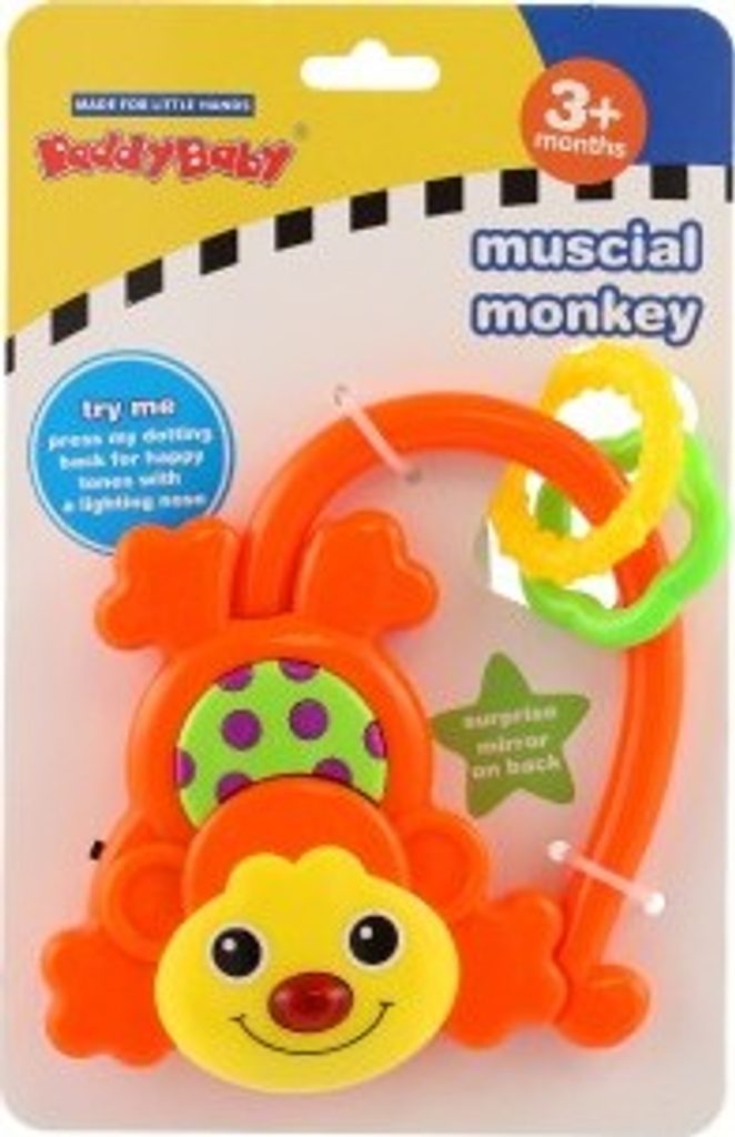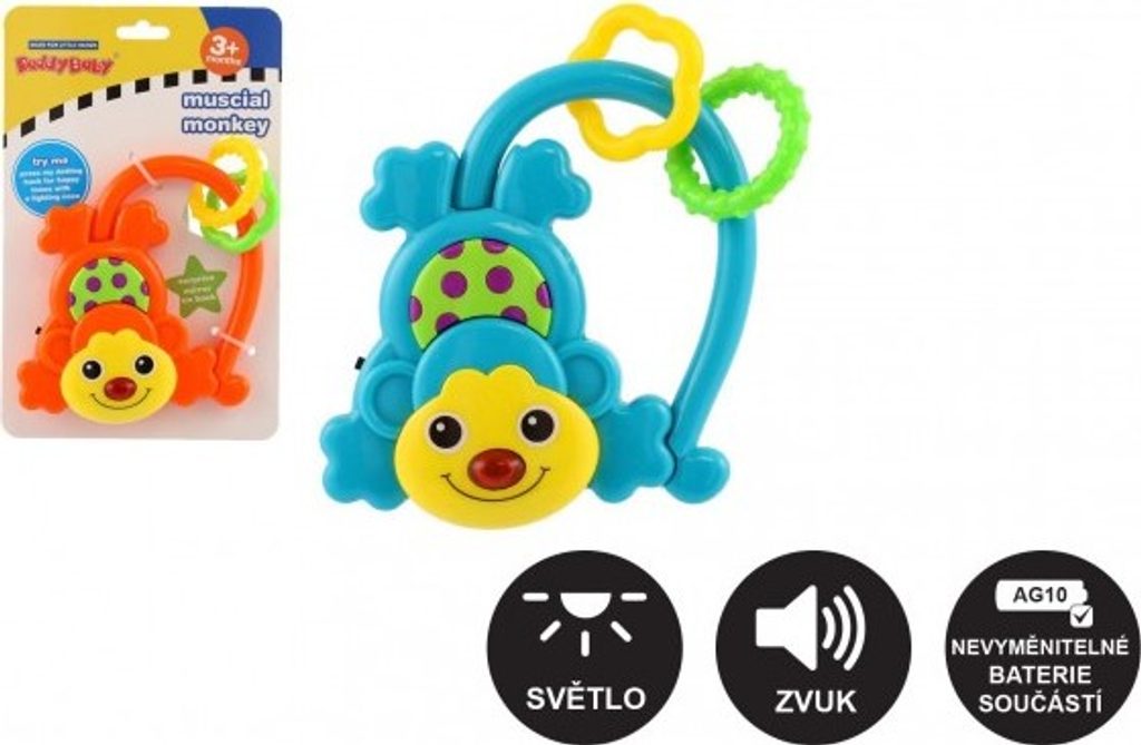 Chrastítko ve tvaru opičky s kousátky a zrcátkem díky svým veselým barvám zaujme každé dítě. Po zmáčknutí tlačítka hraje melodii a svítí. Chrastítko je vyrobeno z plastu a lze jej tak snadno omýt. Opička je na baterie 2xAG10, které jsou vloženy a nelze je vyměnit.