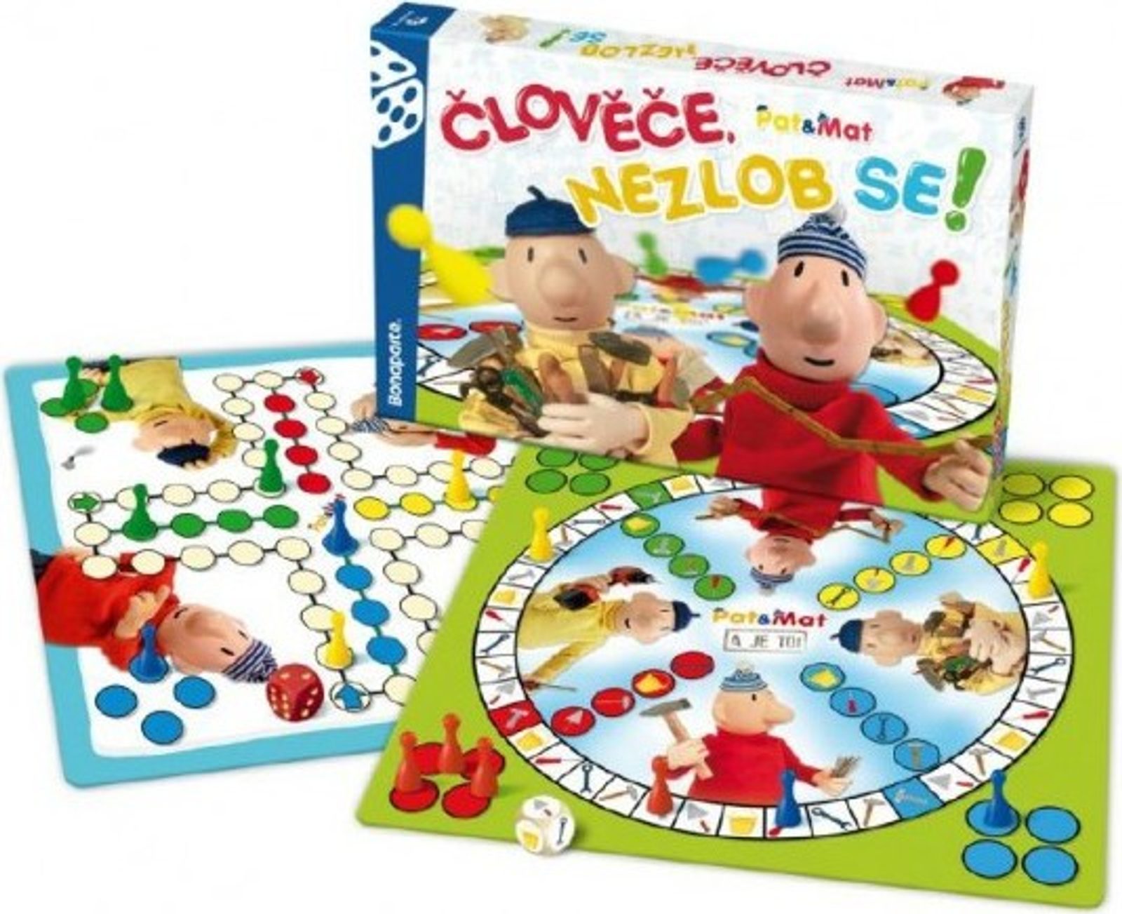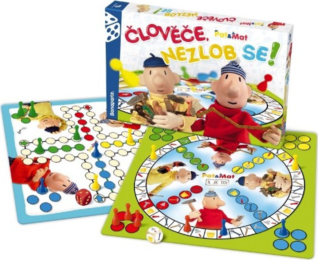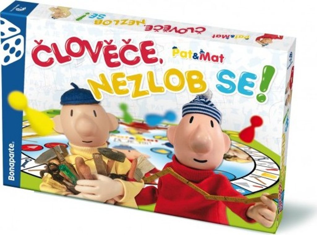 Člověče, nezlob se PAT A MAT je společenská hra po nejmenší děti, která však zabaví i rodiče. Pat a Mat přinášejí dvě varianty klasické hry. Pro nejmenší děti obrázkovou variantu, v níž hrací kostka místo bodů obsahuje obrázky nářadí. A pro ty, co již umí čísla, nabízí variantu klasickou. Obrázkové Člověče, nezlob se PAT a MAT mohou hrát děti již od tří let. Děti si při hře osvojí také schopnost soustředit se a rovněž i umění vyrovnat se s prohrou.