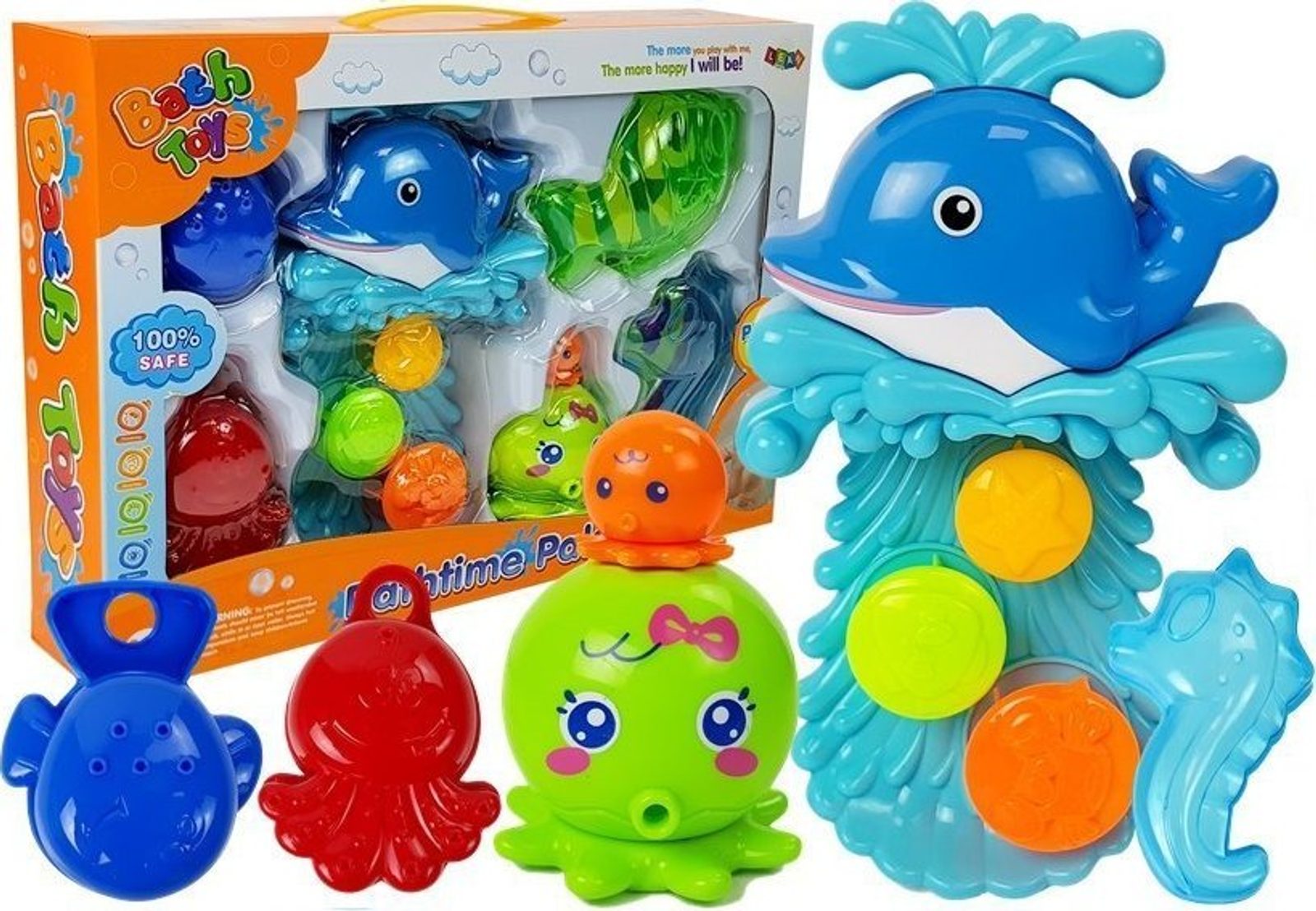 Velký delfín pod vlivem proudu vody vytváří nádherný vodopád, který může vaše dítě obdivovat. Zároveň uvádí do pohybu 3 kolečka s odraženými vzory vodního světa. Hračka má na zadní straně přísavky, takže ji lze snadno připevnit k vaně.