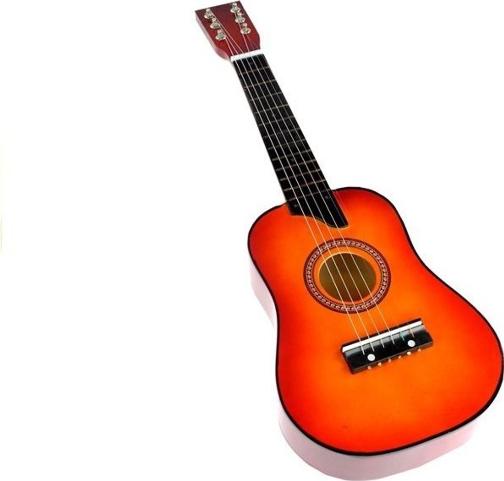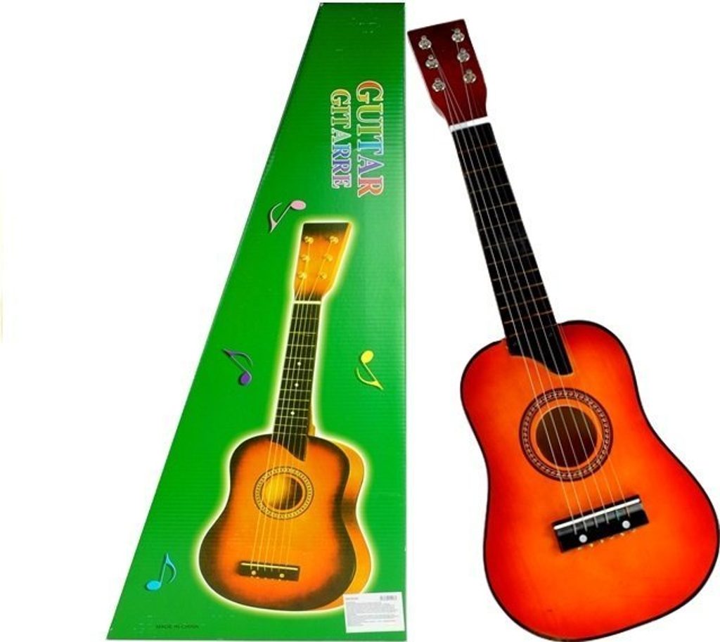 Dřevěná kytara 60 CM, červená. Tato úžasná kytara je skutečným hudebním nástrojem pro vaše dítě. Od skutečné kytary se liší svými rozměry, které jsou přizpůsobeny potřebám malého dítěte.
