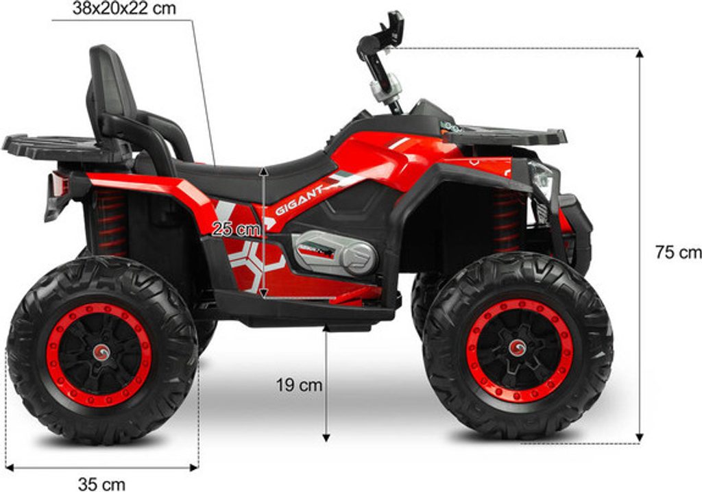 Dětská elektrická čtyřkolka Gigant, která zažehne vášeň vašeho dítěte pro jízdu v terénu. Pohodlí čtyřkolky zajišťuje prostorná sedačka z ekokůže. Díky 4 výkonným 45W motorům a velkým EVA kolům si GIGANT snadno poradí s nerovným terénem. Vozidlo má 2 rychlosti jízdy a možnost jízdy vzad. Multimediální panel s USB a Bluetooth vstupy vám umožní hrát vaše oblíbené melodie a přitom se bavit. GIGANT může ovládat rodič pomocí dálkového ovladače.