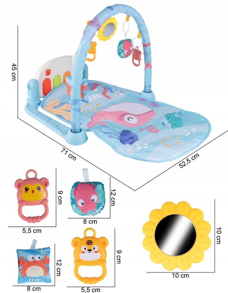 Barevná hrací deka Ocean je určena Vašemu dítěti už od narození. Součástí deky je hrazdička se zavěšenými kousátky, hračkami a malinkým zrcadlem a také pianko, které svítí a hraje melodie. Dítě si může v leže hrát s chrastítky a sledovat se u toho v zrcátku a pianko může být využito jako uspávací melodie (0-12 měsíců). Na břiše se dítě naučí zvedat hlavičku a pozorovat věci kolem sebe, pomůže mu k prvním krůčkům a zároveň odděluje dítě od chladné podlahy (6-18 měsíců). Pokud již dítě samostatně sedí může hrát na pianko nebo ho využít jako interaktivní stoleček. Zároveň se tím prohlubuje motorika dítěte, rozvíjí se sluch a zrak (6-36 měsíců).
