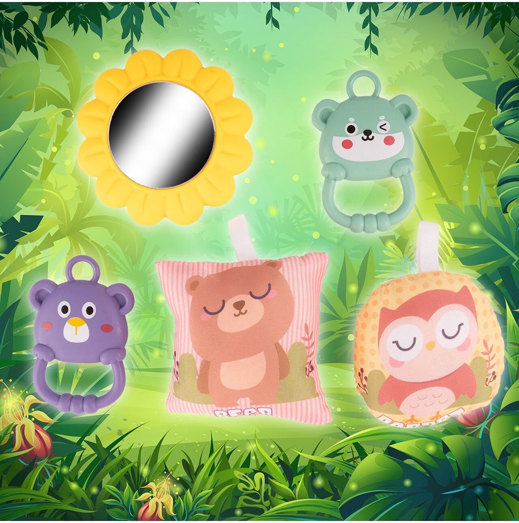• na hrazdičce jsou zavěšeny dvě kousátka, dvě měkké hračky a malinké zrcadlo
