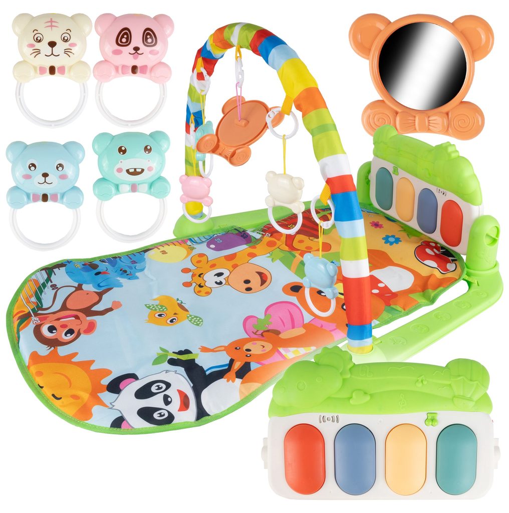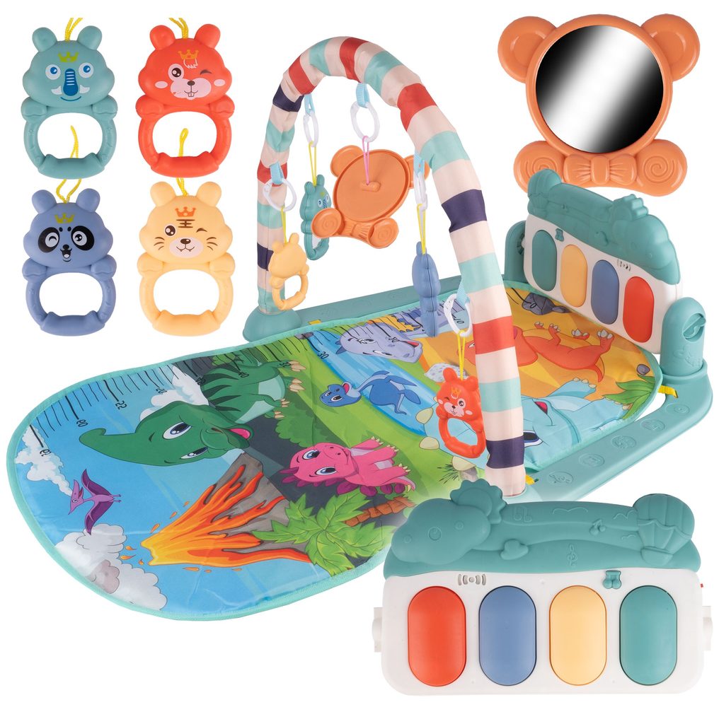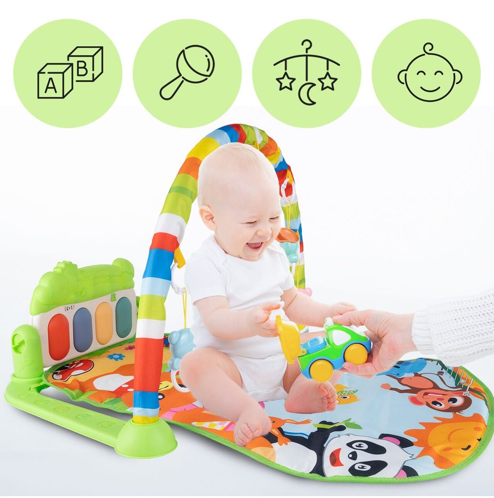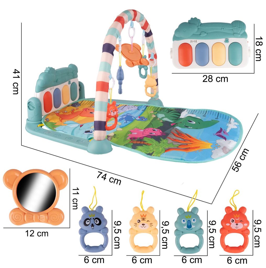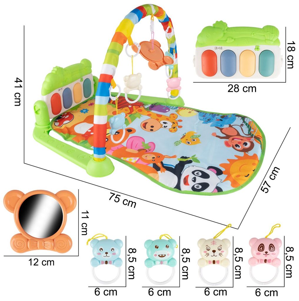 Barevná hrací deka Pedal Piano je určena Vašemu dítěti už od narození. Součástí deky je hrazdička se zavěšenými chrastítky ve tvaru medvídků a malinkým zrcadlem a také pianko, které svítí a hraje melodie. Dítě si může v leže hrát s chrastítky a sledovat se u toho v zrcátku a pianko může být využito jako uspávací melodie (0-12 měsíců). Na břiše se dítě naučí zvedat hlavičku a pozorovat věci kolem sebe, pomůže mu k prvním krůčkům a zároveň odděluje dítě od chladné podlahy (6-18 měsíců). Pokud již dítě samostatně sedí může hrát na pianko nebo ho využít jako interaktivní stoleček. Zároveň se tím prohlubuje motorika dítěte, rozvíjí se sluch a zrak (6-36 měsíců).