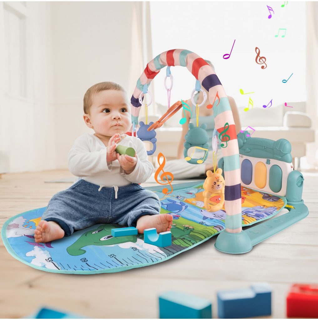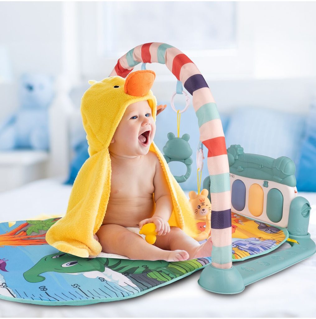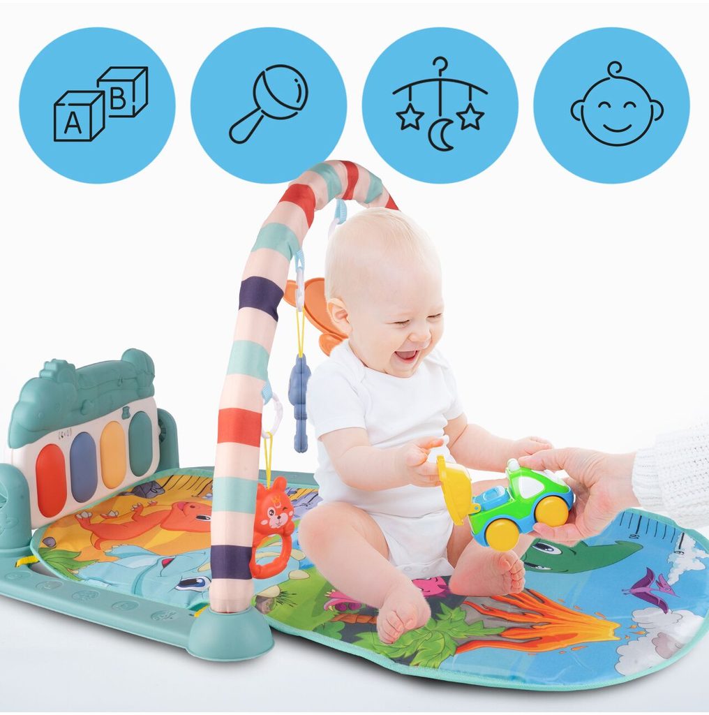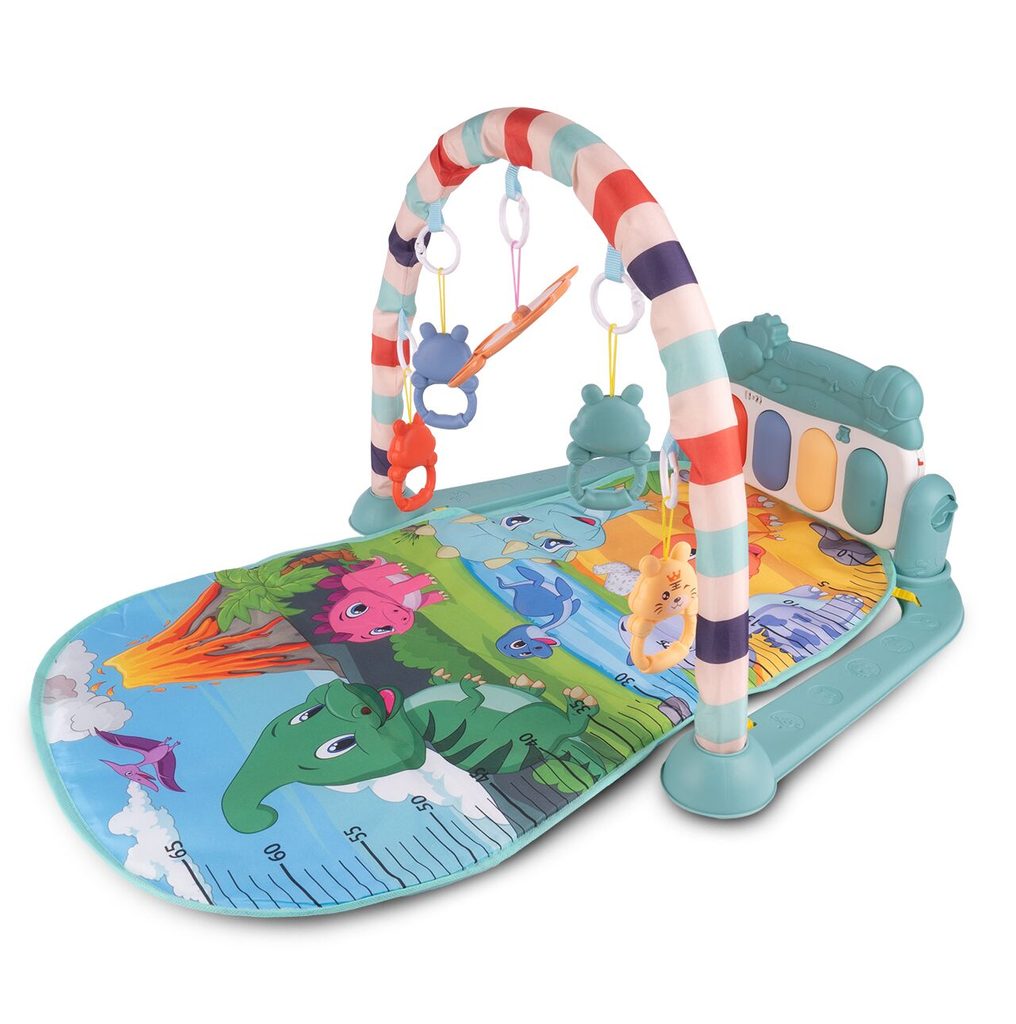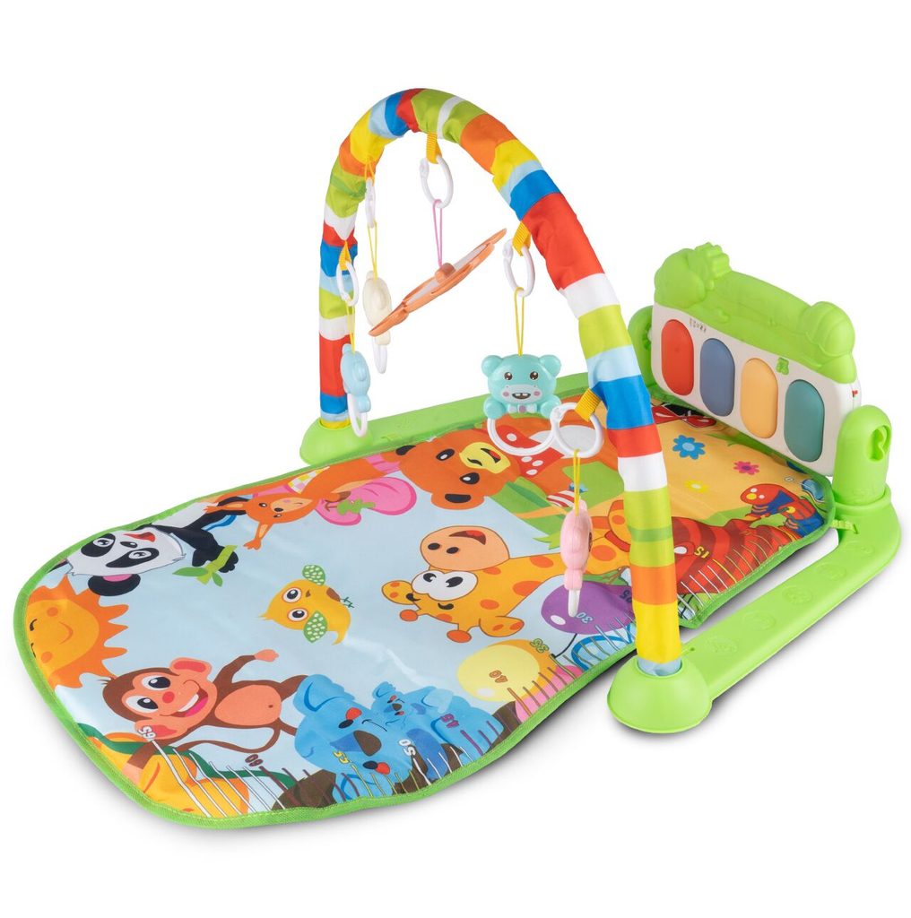 Barevná hrací deka Pedal Piano je určena Vašemu dítěti už od narození. Součástí deky je hrazdička se zavěšenými chrastítky ve tvaru medvídků a malinkým zrcadlem a také pianko, které svítí a hraje melodie. Dítě si může v leže hrát s chrastítky a sledovat se u toho v zrcátku a pianko může být využito jako uspávací melodie (0-12 měsíců). Na břiše se dítě naučí zvedat hlavičku a pozorovat věci kolem sebe, pomůže mu k prvním krůčkům a zároveň odděluje dítě od chladné podlahy (6-18 měsíců). Pokud již dítě samostatně sedí může hrát na pianko nebo ho využít jako interaktivní stoleček. Zároveň se tím prohlubuje motorika dítěte, rozvíjí se sluch a zrak (6-36 měsíců).