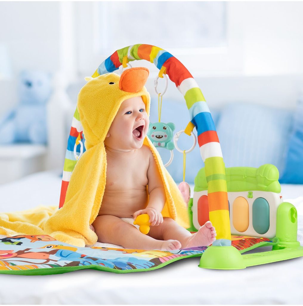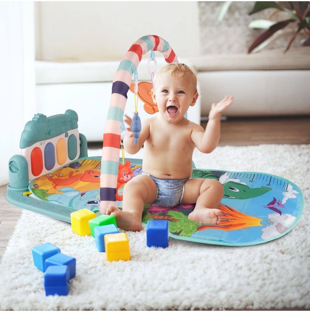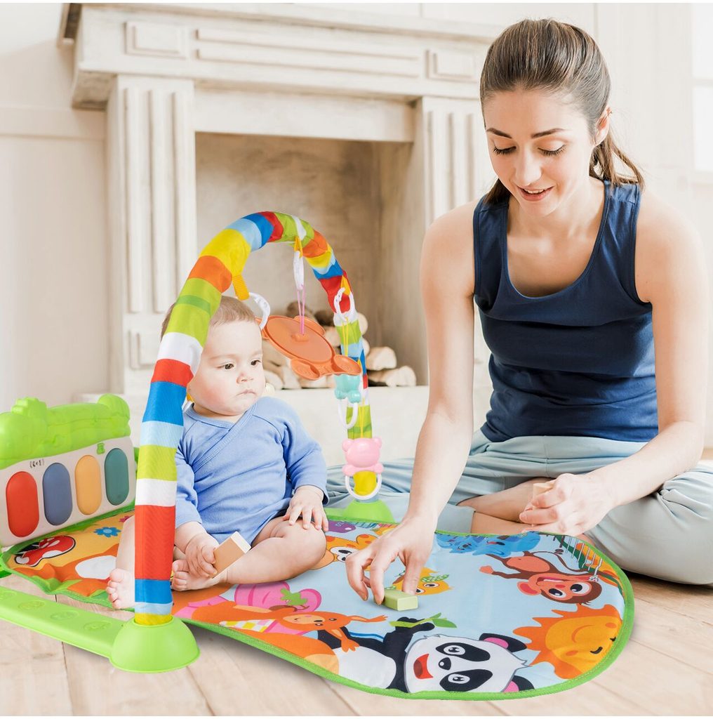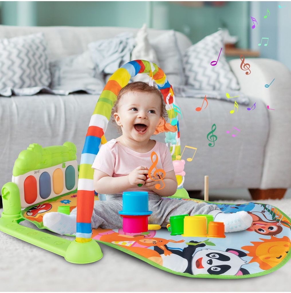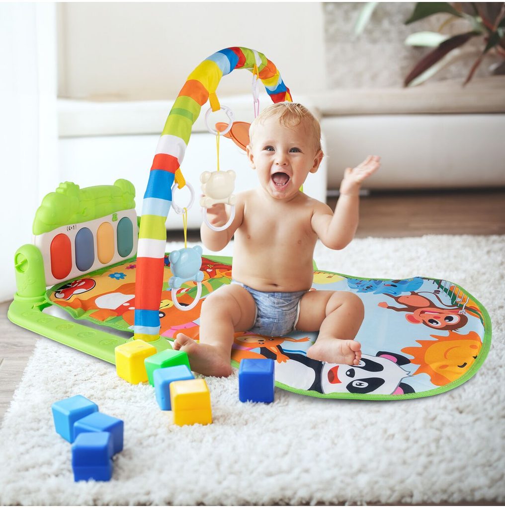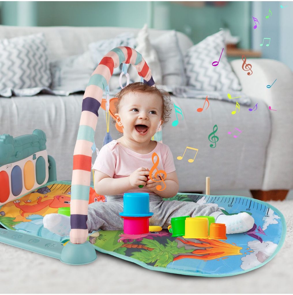 Barevná hrací deka Pedal Piano je určena Vašemu dítěti už od narození. Součástí deky je hrazdička se zavěšenými chrastítky ve tvaru medvídků a malinkým zrcadlem a také pianko, které svítí a hraje melodie. Dítě si může v leže hrát s chrastítky a sledovat se u toho v zrcátku a pianko může být využito jako uspávací melodie (0-12 měsíců). Na břiše se dítě naučí zvedat hlavičku a pozorovat věci kolem sebe, pomůže mu k prvním krůčkům a zároveň odděluje dítě od chladné podlahy (6-18 měsíců). Pokud již dítě samostatně sedí může hrát na pianko nebo ho využít jako interaktivní stoleček. Zároveň se tím prohlubuje motorika dítěte, rozvíjí se sluch a zrak (6-36 měsíců).