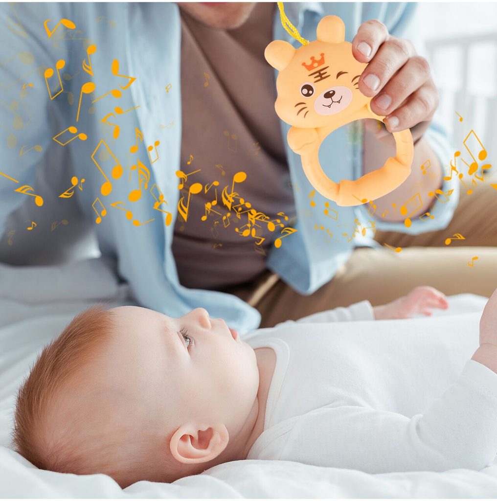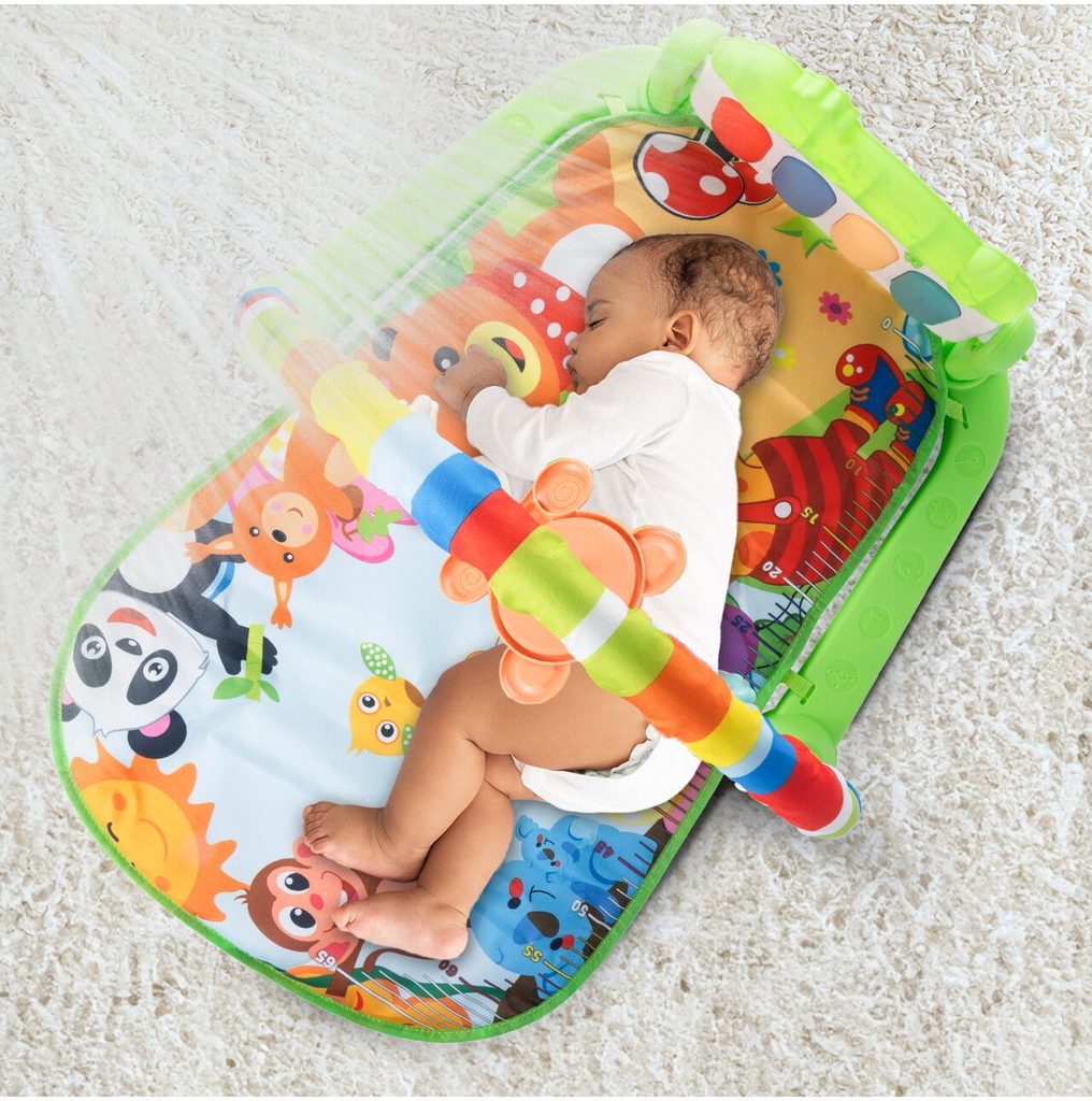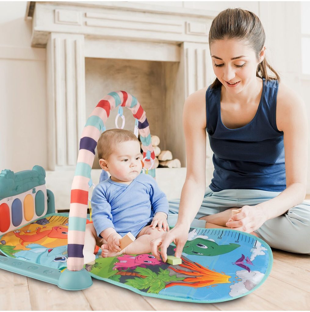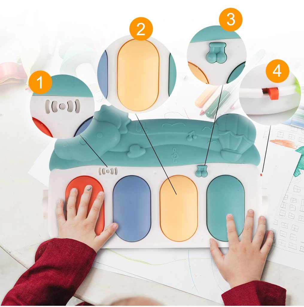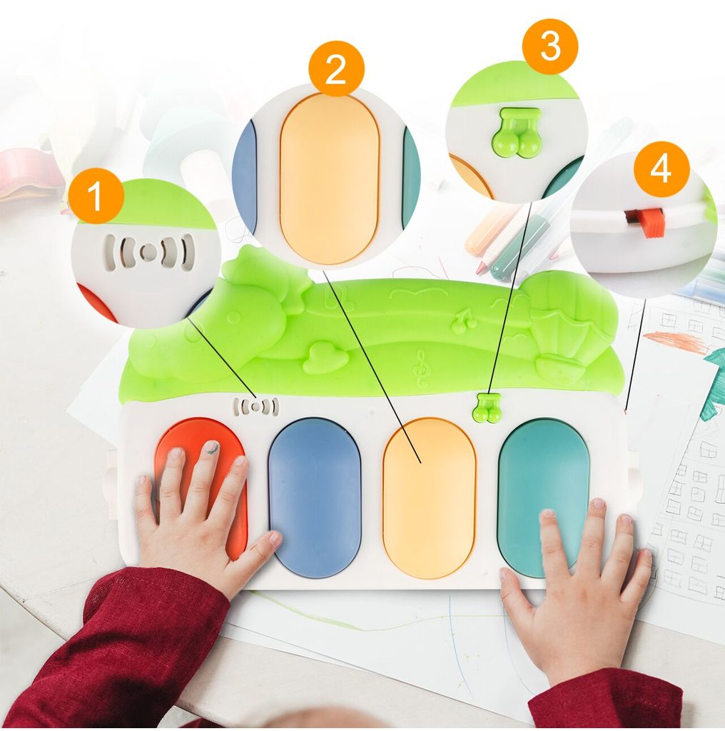 Barevná hrací deka Pedal Piano je určena Vašemu dítěti už od narození. Součástí deky je hrazdička se zavěšenými chrastítky ve tvaru medvídků a malinkým zrcadlem a také pianko, které svítí a hraje melodie. Dítě si může v leže hrát s chrastítky a sledovat se u toho v zrcátku a pianko může být využito jako uspávací melodie (0-12 měsíců). Na břiše se dítě naučí zvedat hlavičku a pozorovat věci kolem sebe, pomůže mu k prvním krůčkům a zároveň odděluje dítě od chladné podlahy (6-18 měsíců). Pokud již dítě samostatně sedí může hrát na pianko nebo ho využít jako interaktivní stoleček. Zároveň se tím prohlubuje motorika dítěte, rozvíjí se sluch a zrak (6-36 měsíců).
