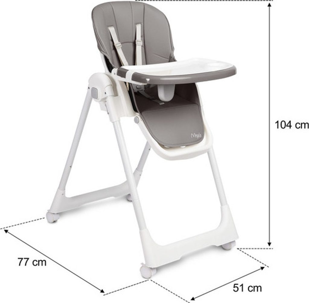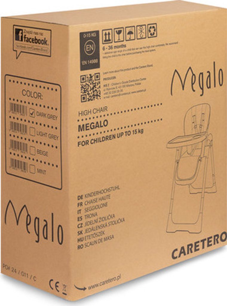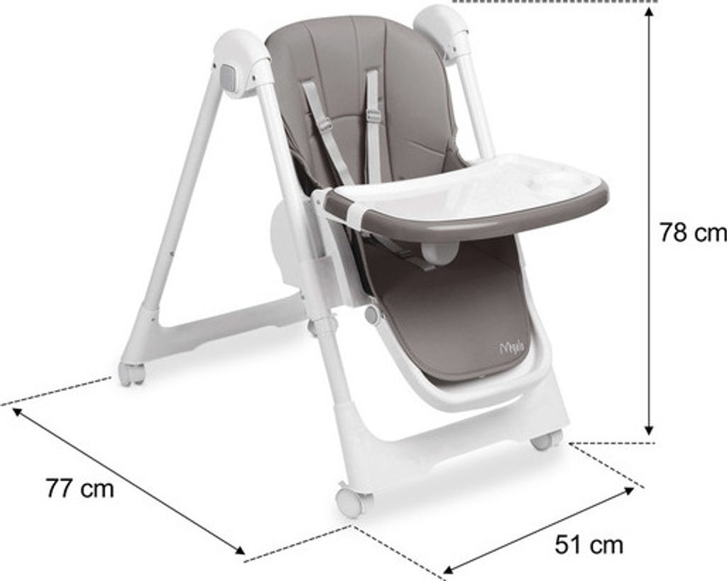 Skládací dětská jídelní židlička Megalo je lehká a pohodlná. Nízká hmotnost a pohodlí díky možnosti složení do malých rozměrů jsou silnými stránkami výrobku. Prostorné sedátko s nastavitelnou vaničkou a bezpečnostními popruhy zajistí, že vaše děťátko bude moci jíst v pohodlí. Sedátko je potaženo čalouněním z ekokůže, které lze snadno sejmout a vyčistit. Nastavitelná výška židle umožňuje zvolit optimální nastavení podle vašich potřeb. Židlička Megalo má pogumovaná kolečka s aretací, díky nimž ji lze snadno přemisťovat, aniž by došlo k poškození podlahy.